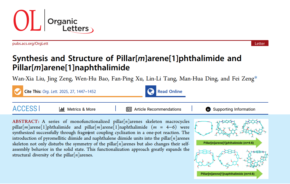 (本网讯 曾飞)近日,化学与生物工程学院2022级化学专业本科生刘晚霞以第一作者身份在国际知名期刊Organic Letters(中科院一区TOP)上发表题为《Synthesis and Structure of Pillar[m]arene[1]phthalimide and Pillar[m]arene[1]naphthalimide》(柱[m]芳烃[1]苯邻二甲酰亚胺与柱[m]芳烃[1]萘二甲酰亚胺的合成及结构)的高水平科研论文,是beat365官网本科生人才培养质量进一步提升和学科专业建设的标志性成果。