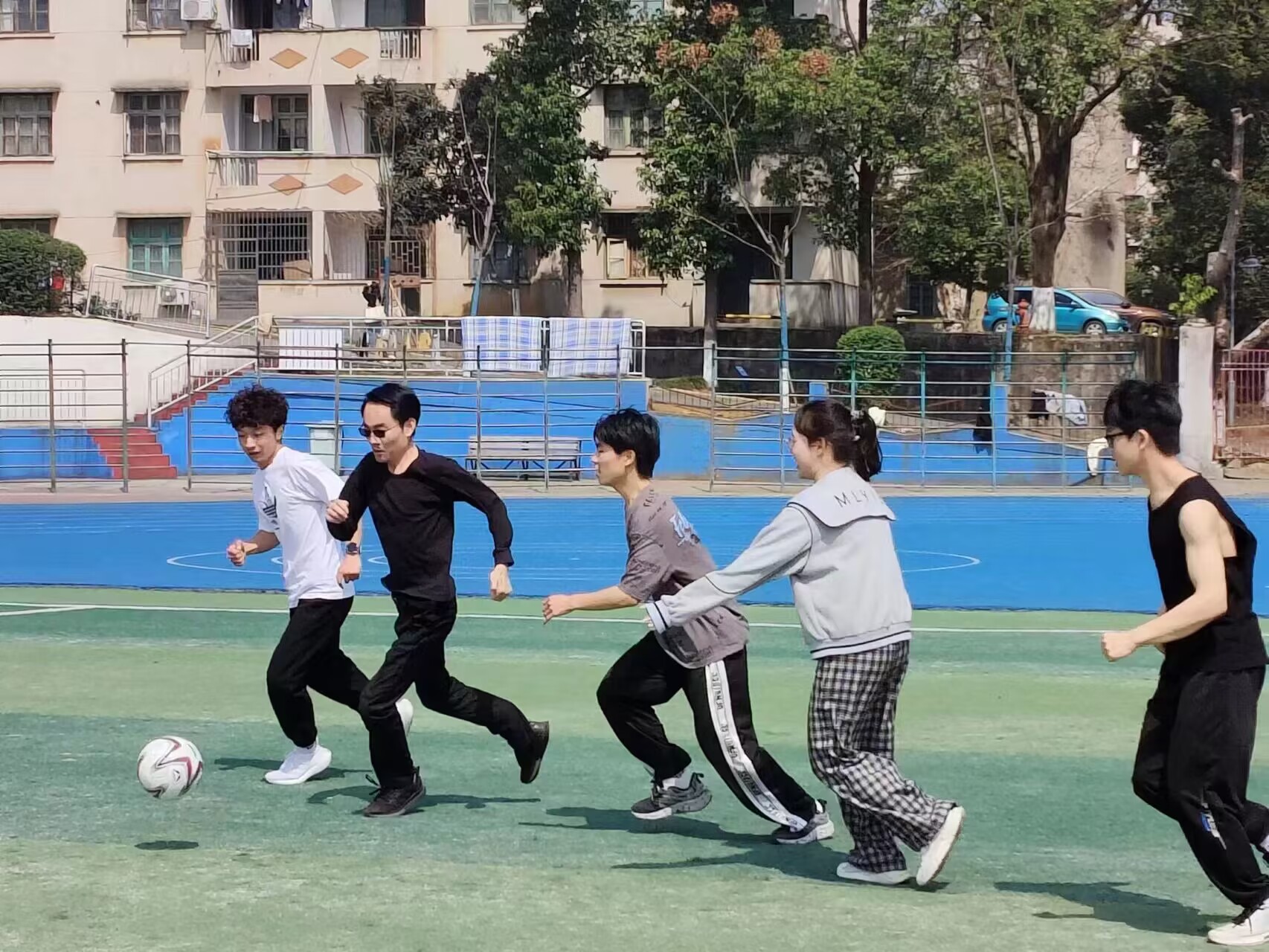 足球场上,生教2201班全体同学排列整齐有序,充满青春朝气。覃佐东强调:“一年之计在于春,一日之计在于晨。春天是播种希望、接续奋斗的美好季节。要珍惜清新的空气、干净的水和灿烂的阳光,平日里同学们应走出教室、走进田径场,多运动、多锻炼、多晒太阳,呼吸新鲜空气,做一个身心健康的新时代青年。”运动过程中,师生们团结协作、尽情奔跑,挥洒汗水。传球、射门,精彩不断。在这场美不胜收的大好春光里收获快乐、释放青春活力。