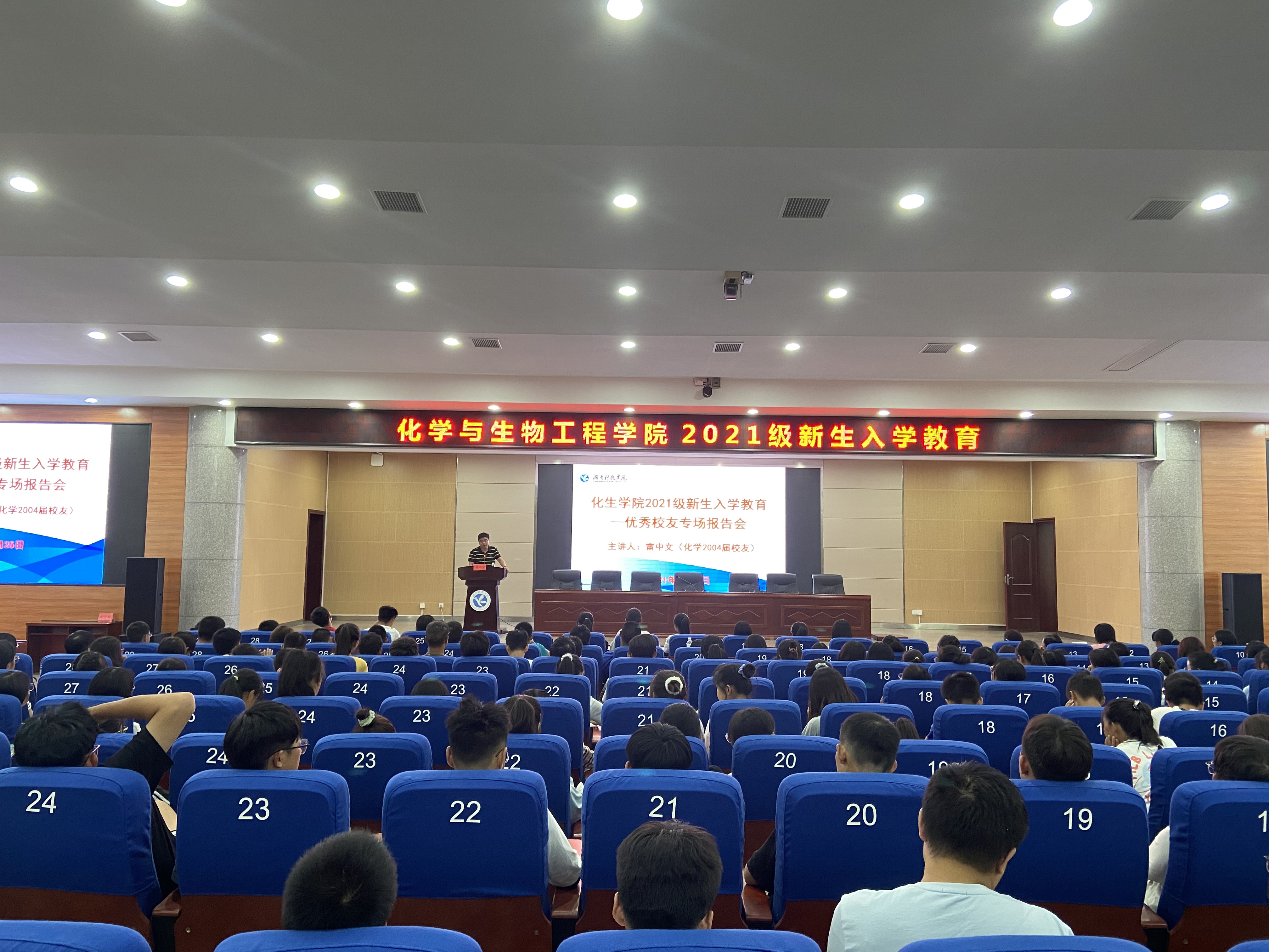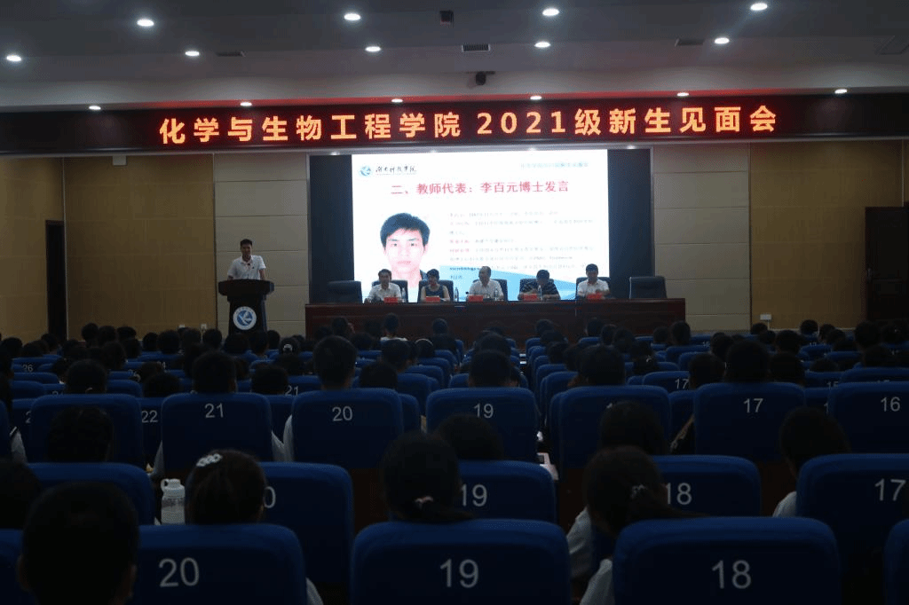 本网讯(通讯员 殷子怡)9月25日晚,化学与生物工程学院在潇湘大讲堂举行2021级新生见面会。出席见面会的有院领导、校友代表、新生辅导员、班主任、老生代表、副班以及415名2021级新生。会议由党总支副书记任学兵主持。