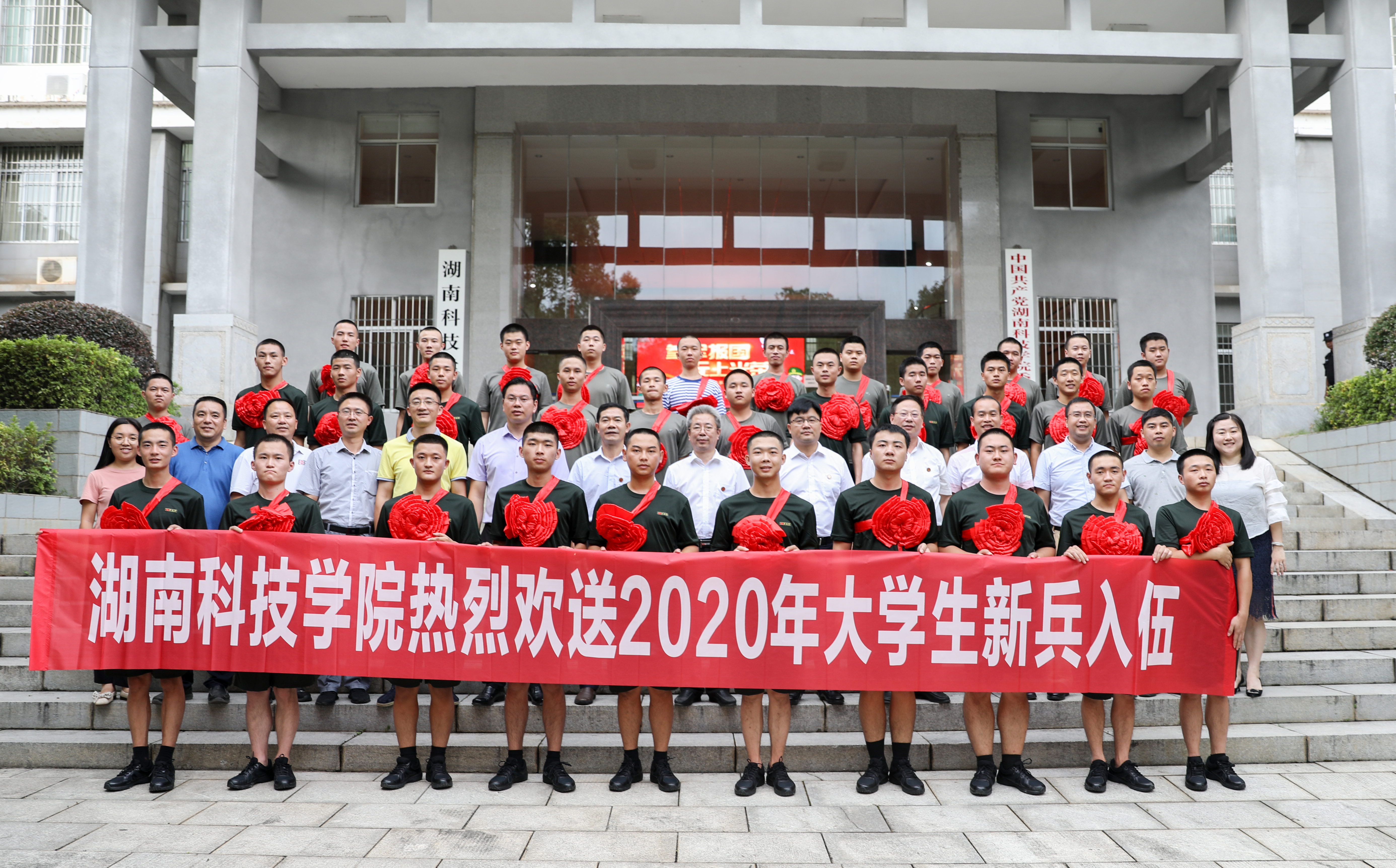 本网讯(通讯员 李燕) 9月9日下午,学校在行政楼举行2020年大学生应征入伍欢送仪式,为35名即将踏入军营的新兵送行。校党委书记曾宝成,党委副书记、校长李钢,副校长吴小林出席欢送仪式,并与新兵合影。