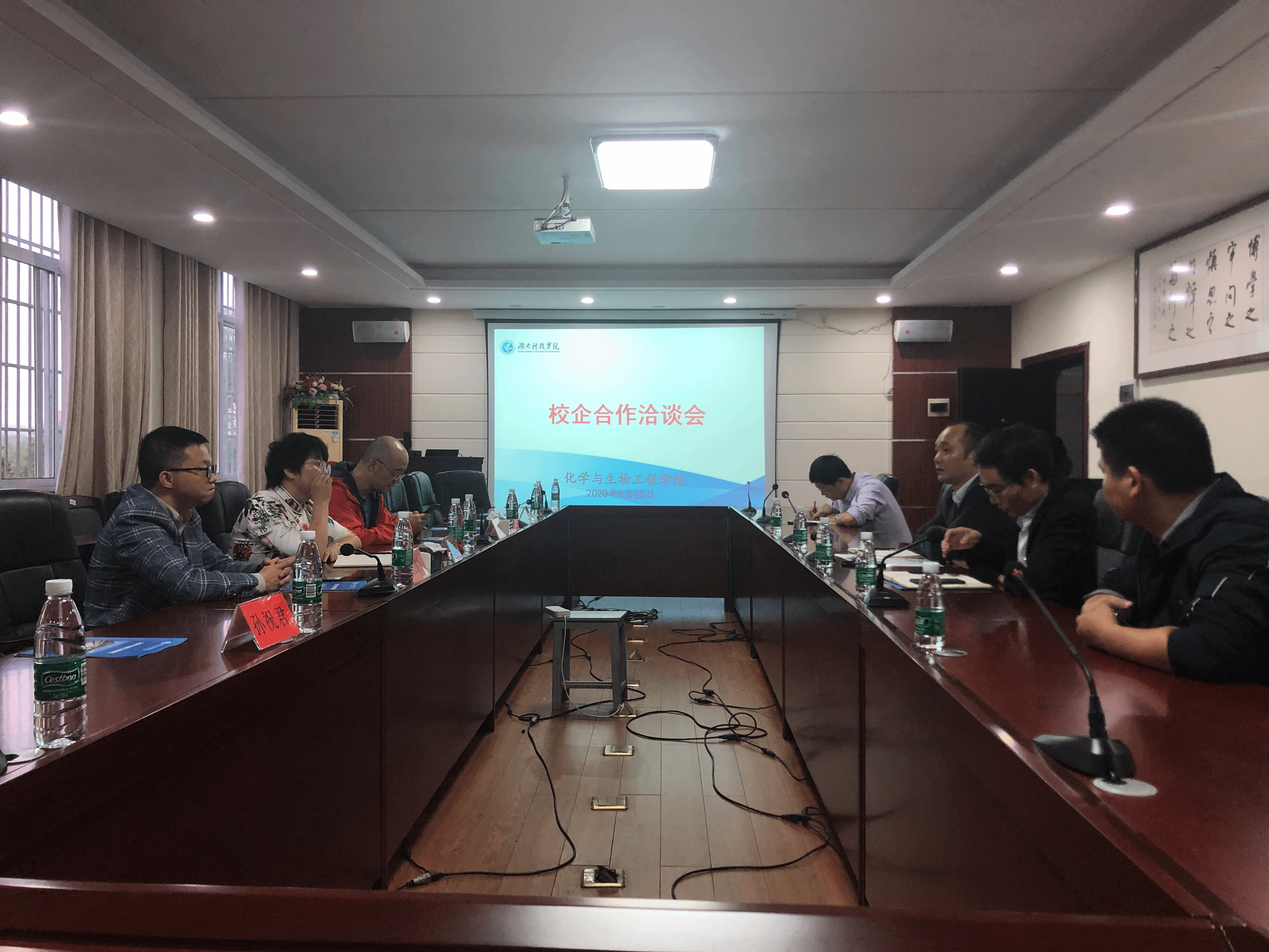 为拓宽校企合作渠道,探索人才培养新模式和推进实习——就业一体化建设,9月25日下午,化学与生物工程学院与省内外一批知名企业的校企合作座谈会在逸夫楼320会议室举行,党总支书记曾二青、副院长覃佐东与浙江我武生物胡赓熙、杭州联川生物郎秋蕾、湖南一鸣教育刘柏清等出席座谈会。