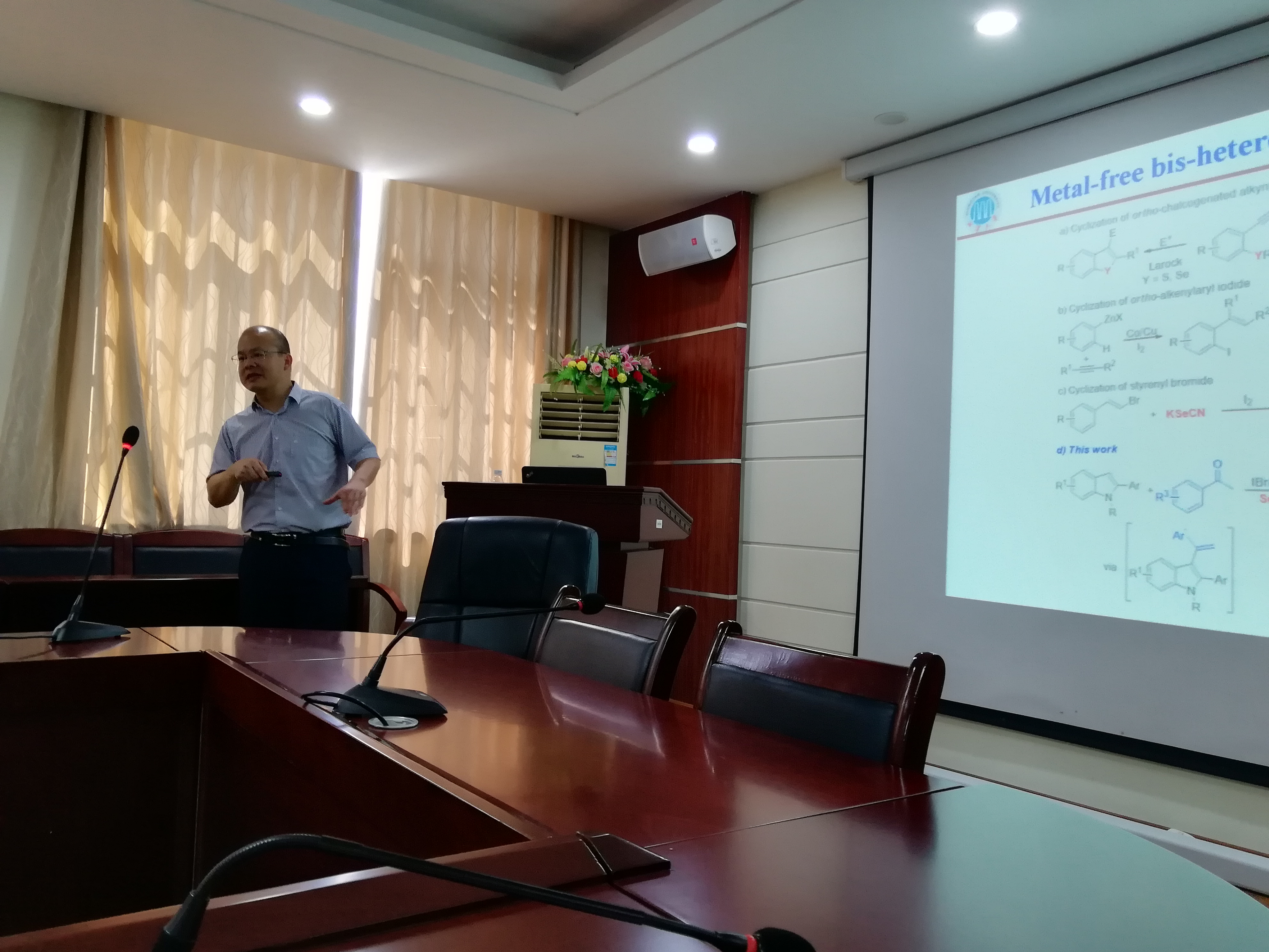 首先,邓国军教授详细介绍了湘潭大学化学学院的基本情况,包括历史沿革、教学平台、科研平台、实验条件、师资队伍、本科生和研究生招生和培养、科学研究等。随后,邓国军讲述了研究团队近几年在无过渡金属催化剂参与条件下的吲哚直接功能化研究成果,他指出,吲哚作为一类优势的含氮杂环分子,在药物中具有的特殊的生物活性,而基于吲哚直接功能化构建具有特定生物活性的含氮杂环化合物是当前的研究热点之一。该课题的研究成果丰富和发展了吲哚直接功能化方法,并且从源头上避免重金属污染,为合成吲哚衍生物提供了一条环境友好的新途径。