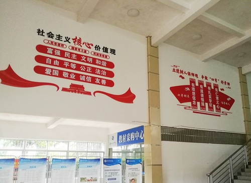 党旗雕塑的红色党旗上书“不忘初心,牢记使命”,底座上写有“立德树人,培养担当民族复兴大任的时代新人”字样。三面党建文化墙红底白字,朴素大方,将社会主义核心价值观、“四有”好老师和习近平总书记在纪念五四运动一百周年大会上对青年学生提出的六点期望等内容简单明了地展现在师生面前,潜移默化地起到涵养作用。