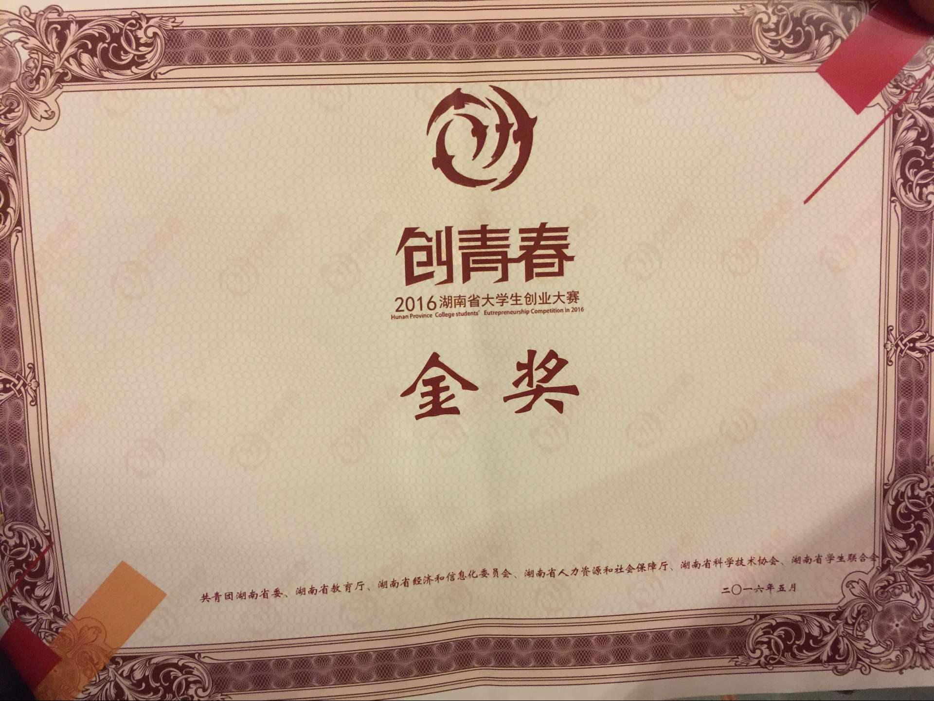学生获得“创青春”2016湖南省大学生创业大赛金奖