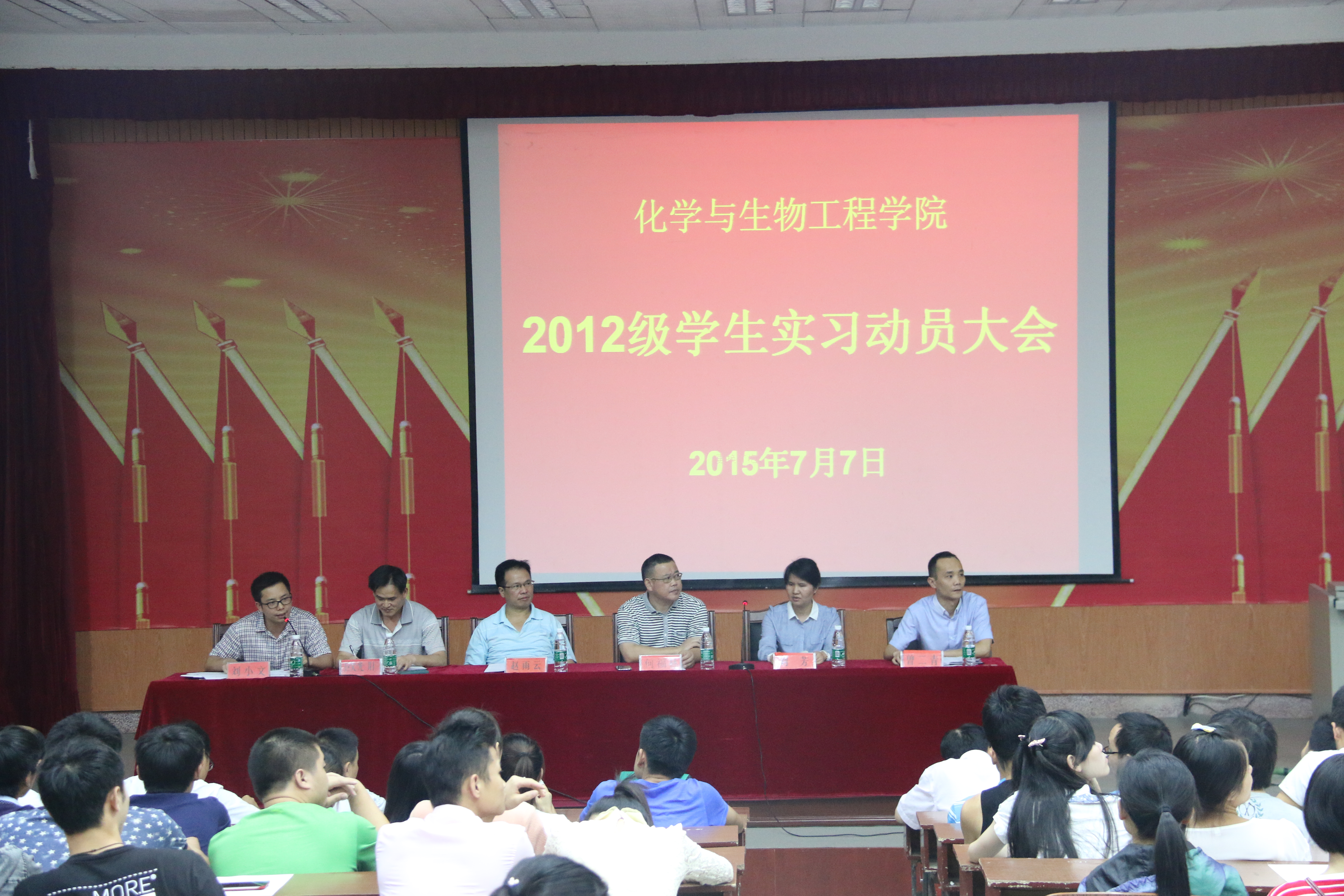 本网讯(许剑桥 屈杰)7月7日下午,化生院在明德楼报告厅举行学生实习动员大会,对全体2012级学生考研和实习工作进行统筹安排。院长何福林、党总支书记赵雨云、副院长刘芳、欧光川、刘小文以及党总支副书记曾二青出席会议。