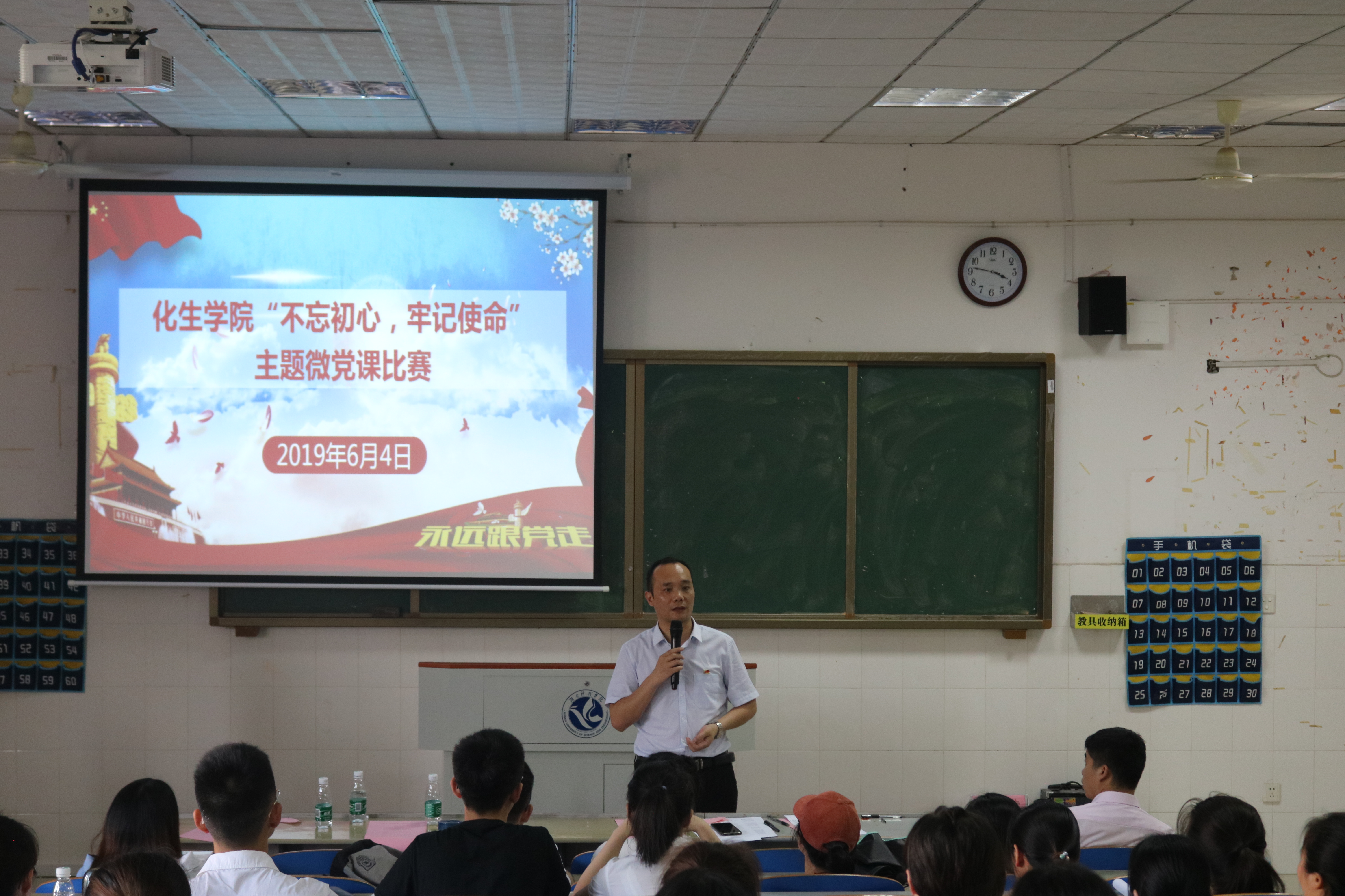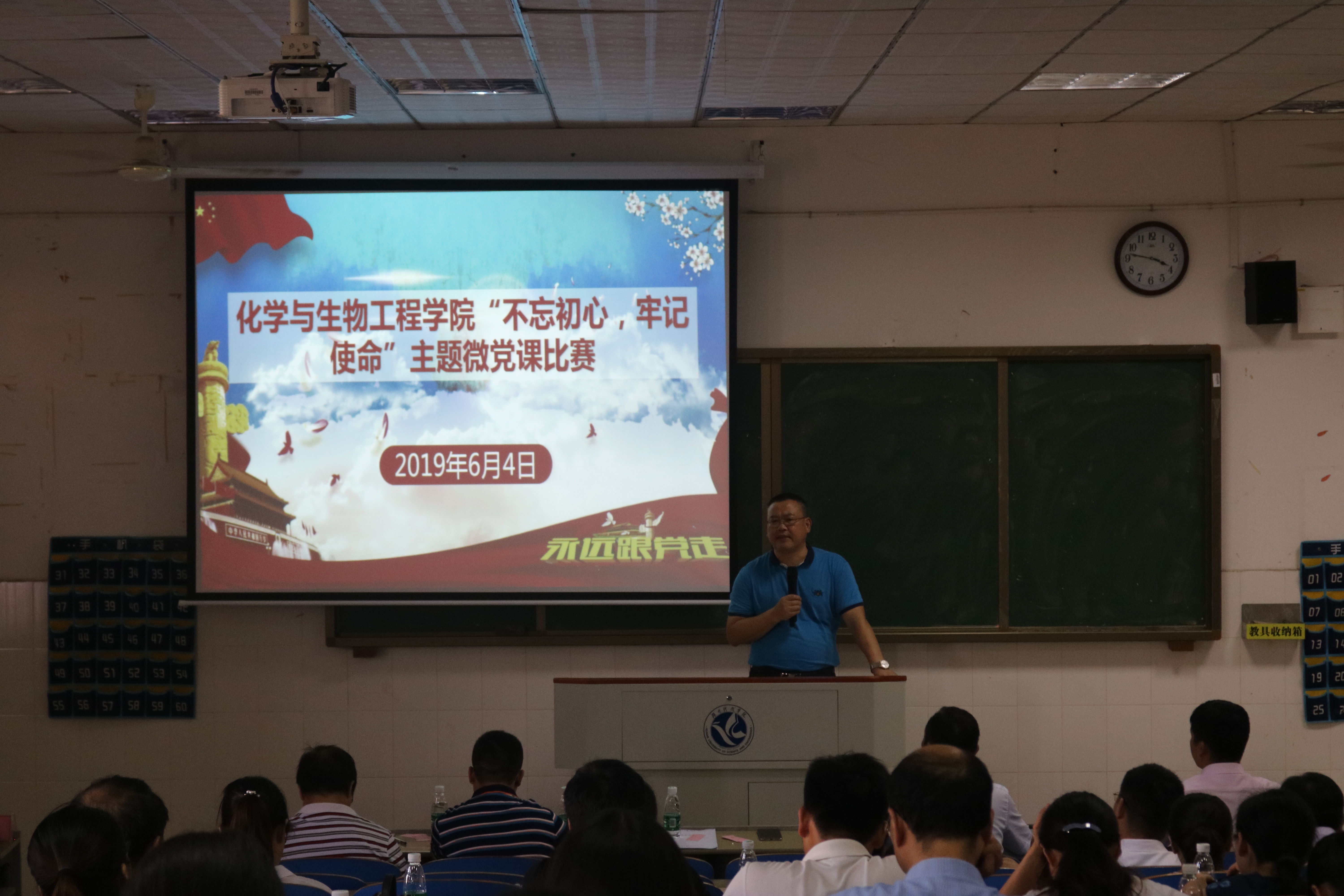 本网讯(通讯员 唐婉婷 贾铄弘)为进一步贯彻落实党的十九大精神,推进“不忘初心,牢记使命”主题教育,化学与生物工程学院6月4日下午在逸夫楼424举行“不忘初心,牢记使命”主题微课堂比赛。校党委组织部部长何福林和学院党政领导受邀担任评委。