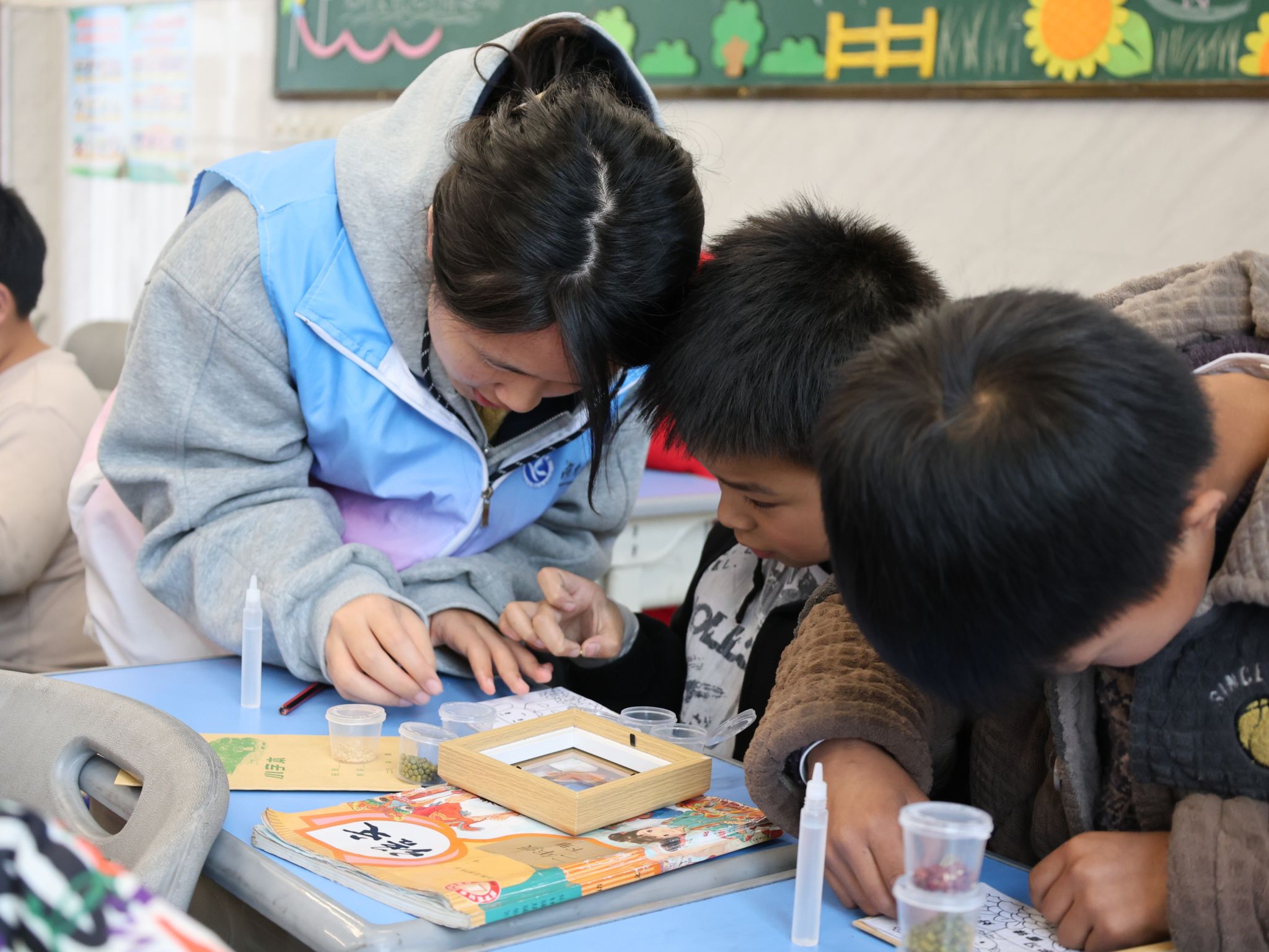 在五谷创作环节,主持人首先进行示范教学,讲解五谷画粘贴技巧及操作安全要点。随后,同学们在志愿者的带领下,动手用五谷拼贴雷锋头像、“为人民服务”字样等图案。活动最后,同学们踊跃上台展示自己的作品,分享创作过程中的感悟与收获。志愿者们对表现突出、创意新颖的同学进行表彰,为他们送上精心准备的小零食奖励,以此鼓励大家继续践行雷锋精神、珍惜粮食。