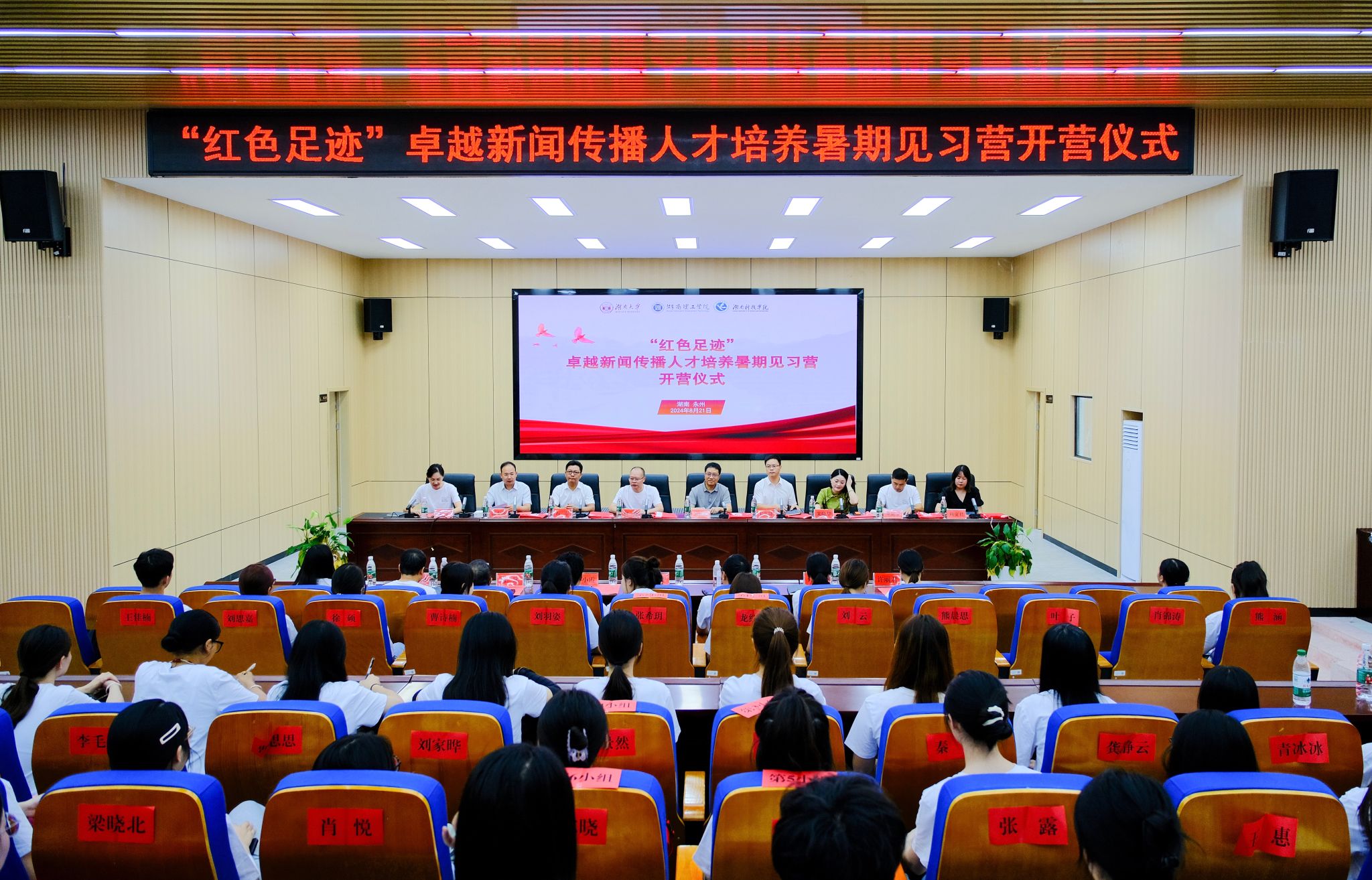 本网讯(通讯员 曹思思 曹子贤)8月21日,由湖南大学新闻与传播学院、湖南理工学院新闻传播学院、湖南省新闻传播学会与beat365官网传媒学院联合举办的“红色足迹”卓越新闻传播人才培养暑期见习营开营仪式在beat365官网举行。湖南省新闻传播学会会长彭祝斌、学校党委委员、副校长何海,传媒学院院长龙运荣、湖南理工学院新闻传播学院院长王文锋、党委书记石军,湖南大学新闻与传播学院党委副书记郭少滨、“湖南日报·新湖南”编辑中心轮值值班主任朱晓华、红网永州站站长周文君等领导以及三所高校师生共58人参加仪式,开营仪式由传媒学院党总支书记刘佳主持。