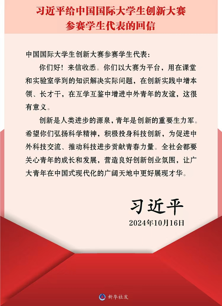 10月16日,中共中央总书记、国家主席、中央军委主席习近平在给中国国际大学生创新大赛参赛学生代表的回信中提到:“你们以大赛为平台,用课堂和实验室学到的知识解决实际问题,在创新实践中增本领、长才干,在互学互鉴中增进中外青年的友谊,这很有意义。”下一步,beat365官网将认真学习习近平总书记重要回信精神,以创新大赛为契机,将其作为创新型人才培养的重要环节,鼓励学科交叉融合、协同创新,促进学生全面发展,深入推进人才培养模式改革,探索构建起“联结、赋能、服务”体系下的“三融四促”创新创业人才培养模式。