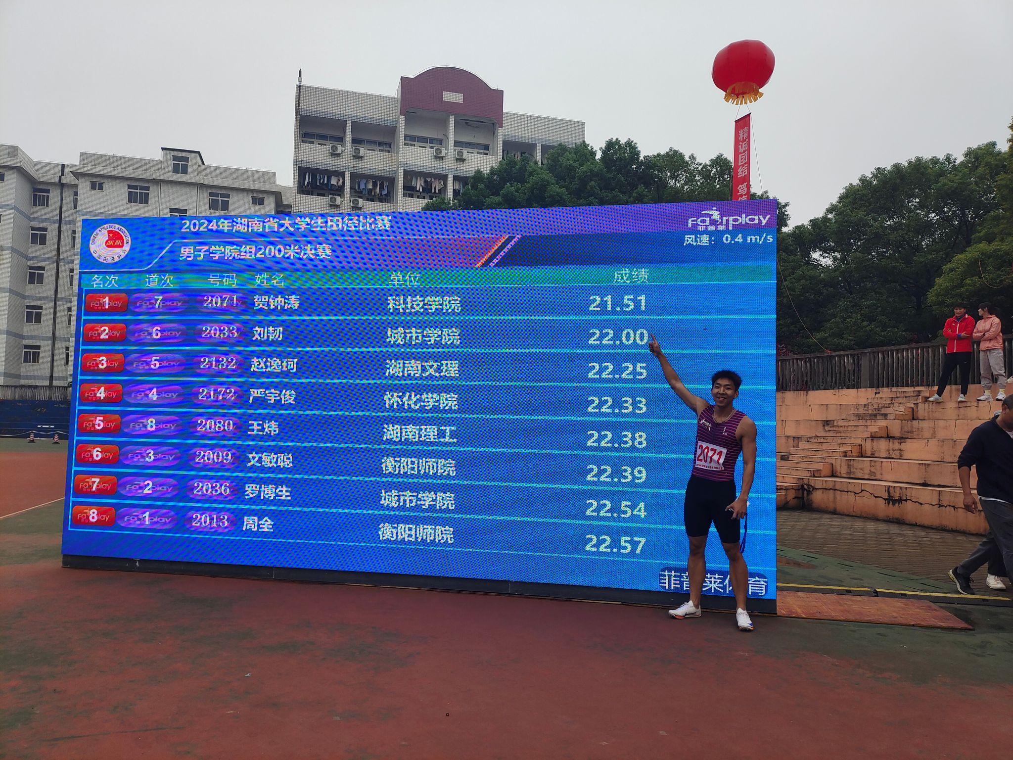 本网讯(通讯员 黄婉 贺钟涛)近日,2024年湖南省大学生田径比赛在湘潭举行。beat365官网体育学院2022级体育教育专业学生贺钟涛过关斩将,勇夺男子学院组100米、200米双冠,实现了beat365官网在相关体育赛事领域的历史性突破!
