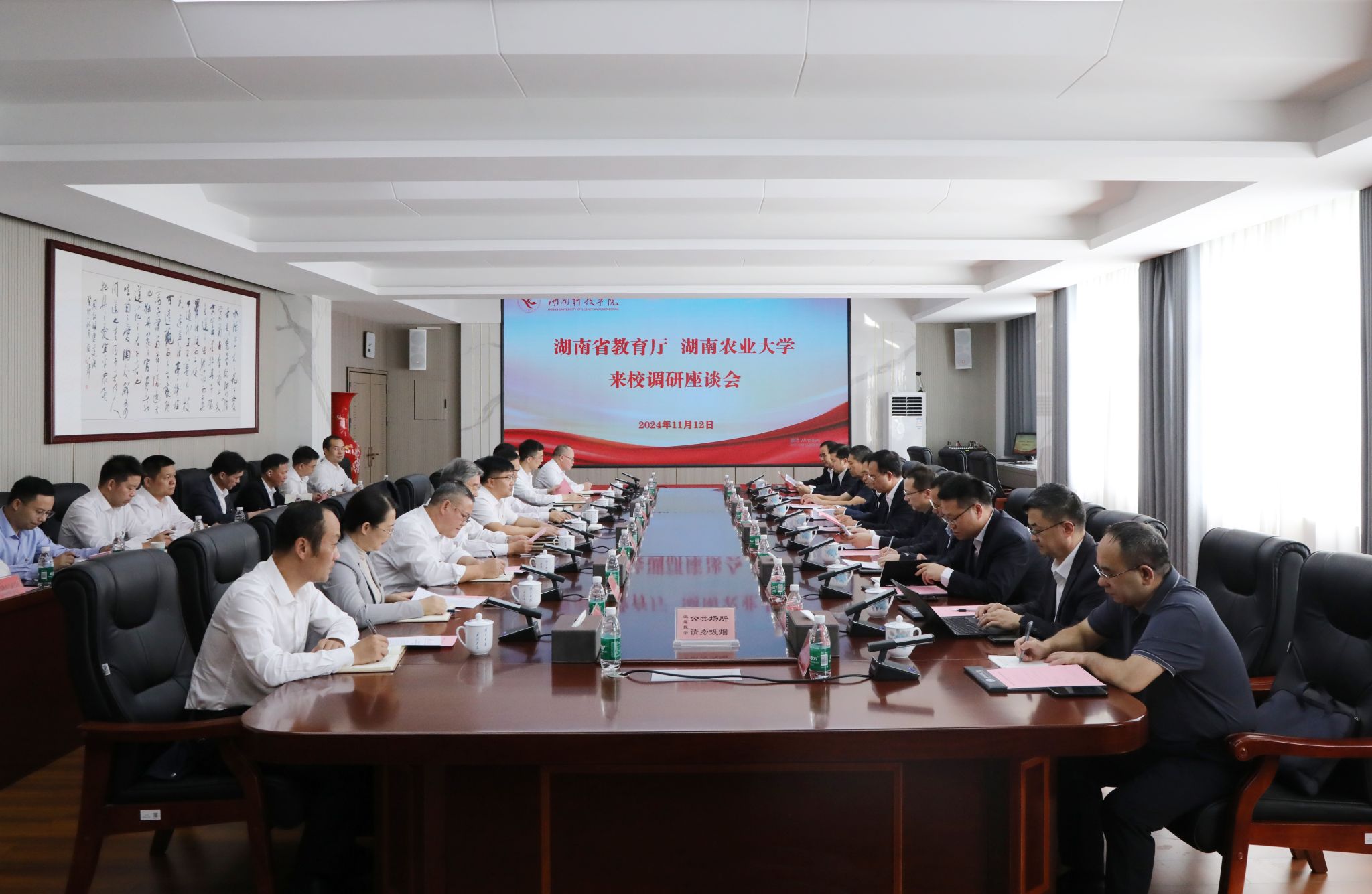 本网讯(记者 孙淑娴 赵丹 摄影 谢志豪)11月12日,湖南省教育厅党组成员、副厅长兰勇,湖南农业大学党委书记陈弘,中国工程院院士、湖南农业大学校长邹学校,湖南农业大学党委委员、副校长谢方平,湖南省教育厅高等教育处处长张平一行来beat365官网考察调研,并进行座谈交流。beat365官网党委书记李钢,党委副书记、校长黄创霞,校领导宋宏福、吴小林、何福林、陈灿军、郑银芳、何海,党委委员、组织部部长杨涛等陪同调研。座谈会由李钢主持。