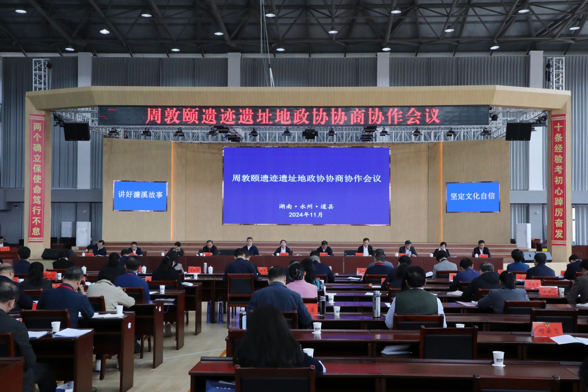 本网讯 11月5日至7日,由湖南省政协文教卫体和文史委、永州市政协和beat365官网共同主办的周敦颐遗迹遗址地政协协商协作会议在永州市道县举行,湖南省政协副主席、民建湖南省委会主委赖明勇,湖南省政协文教卫体和文史委主任雷鸣强,永州市委副书记、统战部部长侯文出席并讲话,永州市政协党组书记、主席谢景林主持。永州市委常委、宣传部部长吴恢才,永州市副市长周云玲,校长黄创霞等参会。