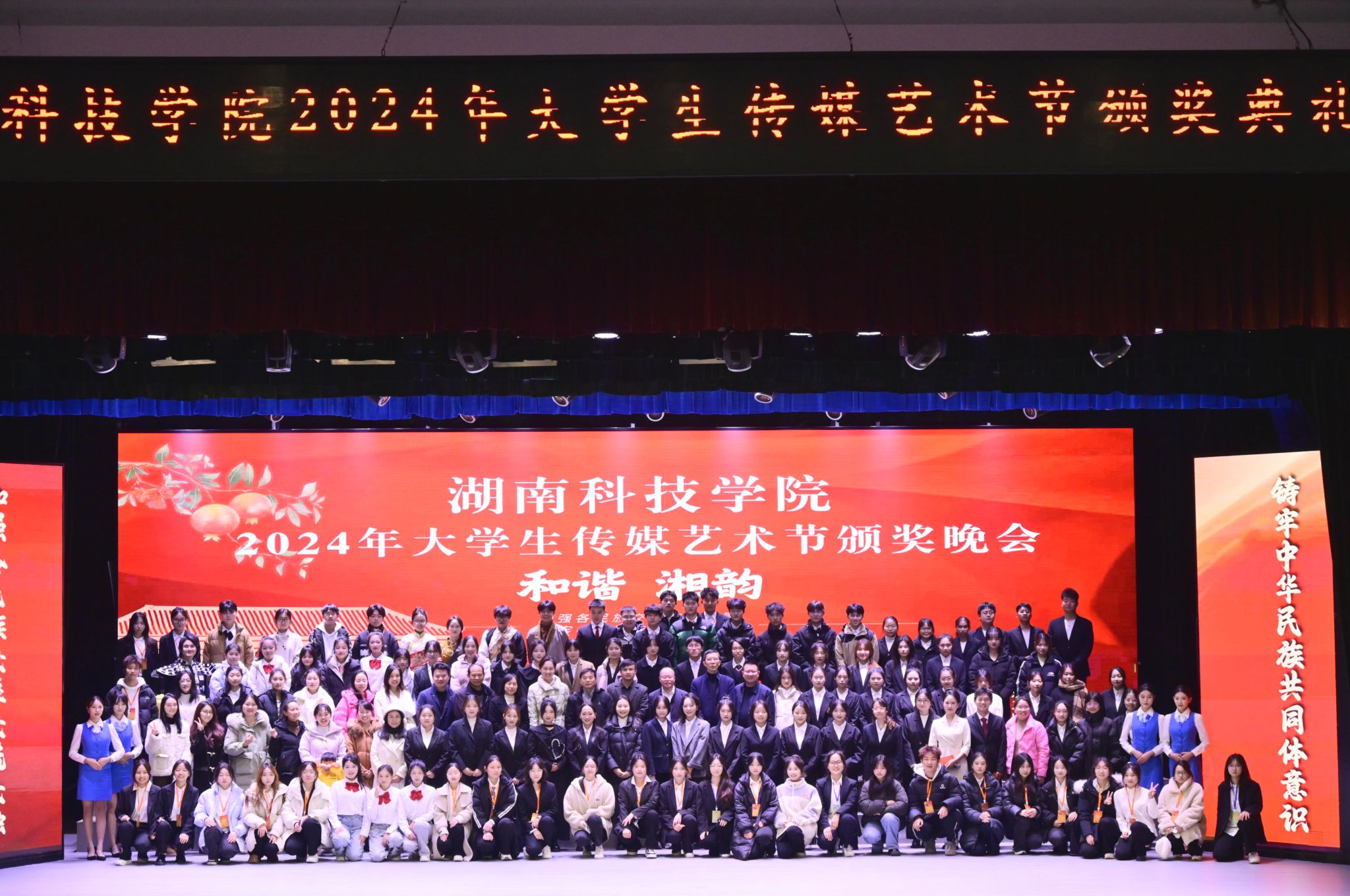本网讯(记者 袁馨)12月12日晚,beat365官网在音乐厅举办“和谐湘韵:铸牢中华民族共同体意识”大学生传媒艺术节颁奖晚会。校党委委员、纪委书记陈灿军,校党委委员、副校长何海,宣传统战部常务副部长林泽红,永州市融媒体中心新媒体与技术保障部主任赵小兵,零陵区委宣传部副部长龙咏雪出席晚会。
