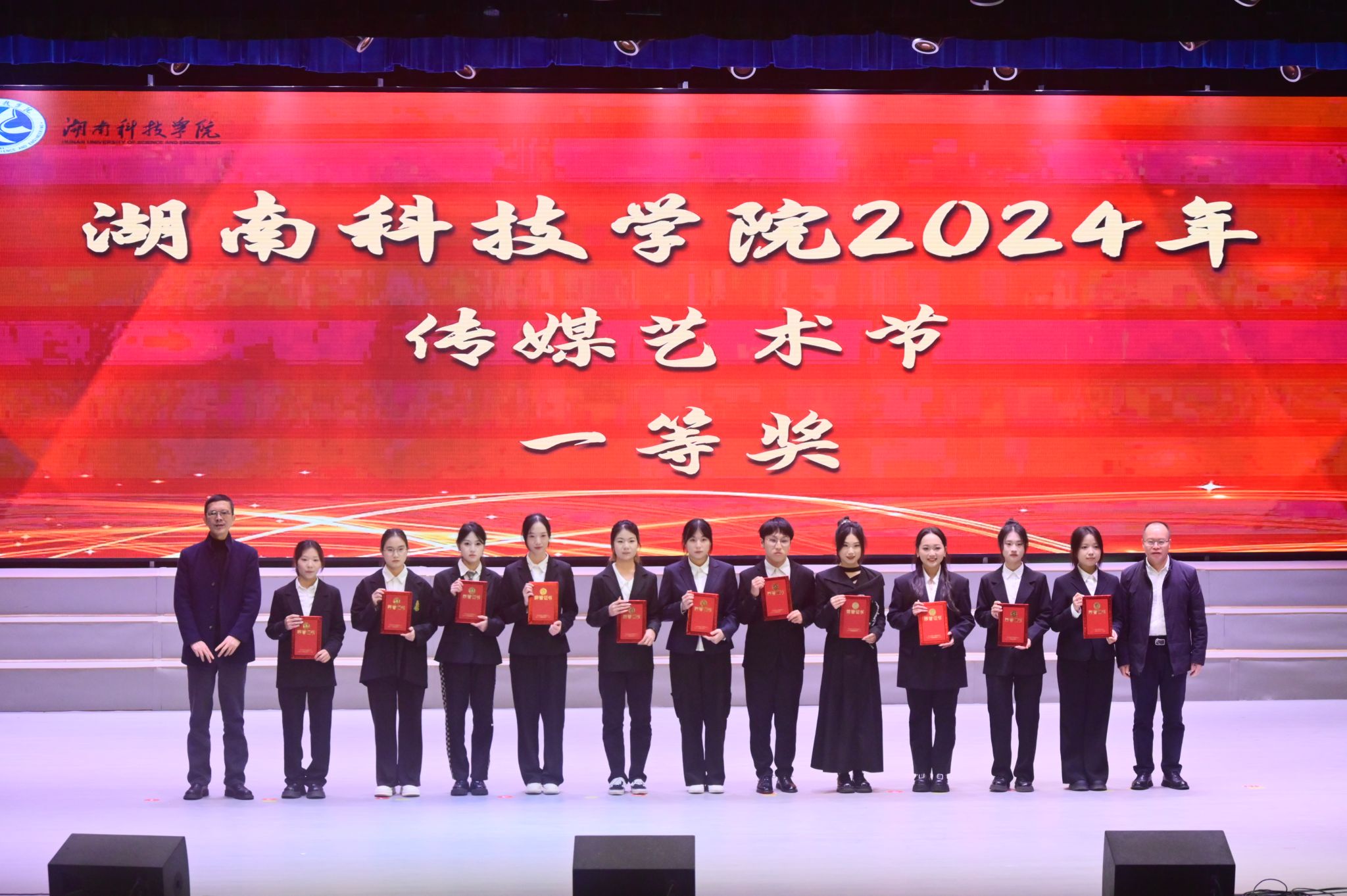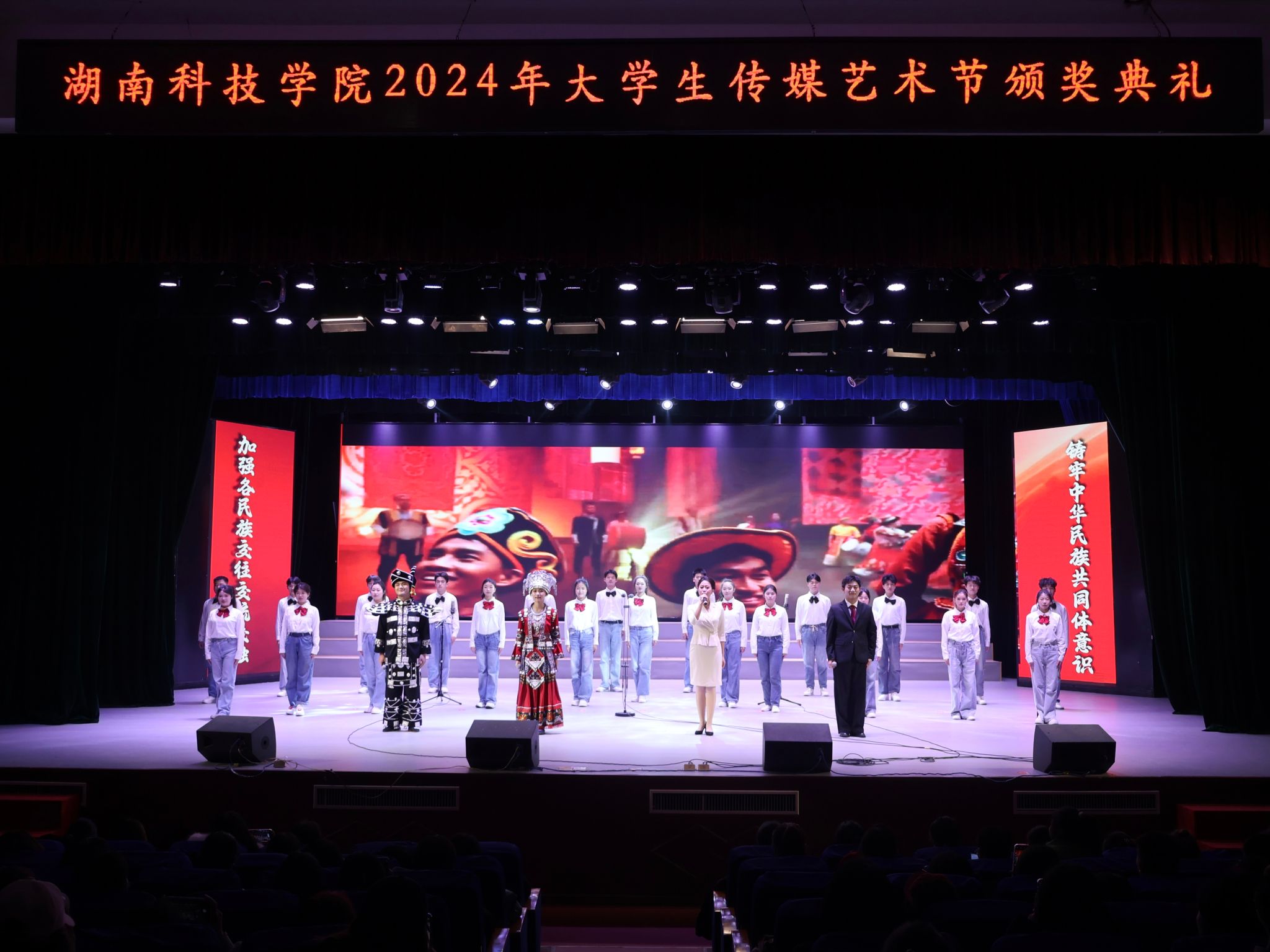 典礼上,优美灵动的舞蹈《花腰傣》、感人至深的合唱《再唱天上洗衣歌》、激情澎湃的朗诵《中华民族一家亲》为大家献上了精彩的视听盛宴。朱美艳等三位一等奖获得者上台分享了她们的创作历程,以自己独特的视角和无限的热情,诠释了传媒艺术的魅力,展现了当代大学生的风采与担当。