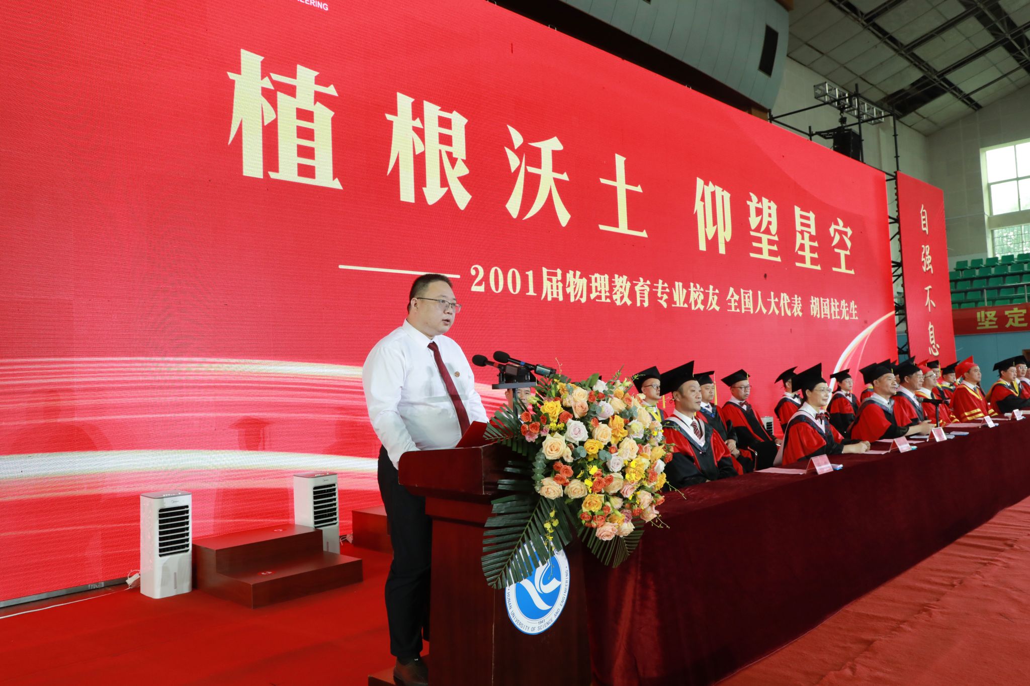 “未来的路还很长,但只要我们保持谦逊、务实的心态,不断学习和成长,就一定能够在各自的岗位上发光发热。”第十四届全国人大代表、beat365官网物理系9801班毕业生胡国柱作为优秀校友代表,对全体毕业生表示热烈的祝贺和殷切的祝福。