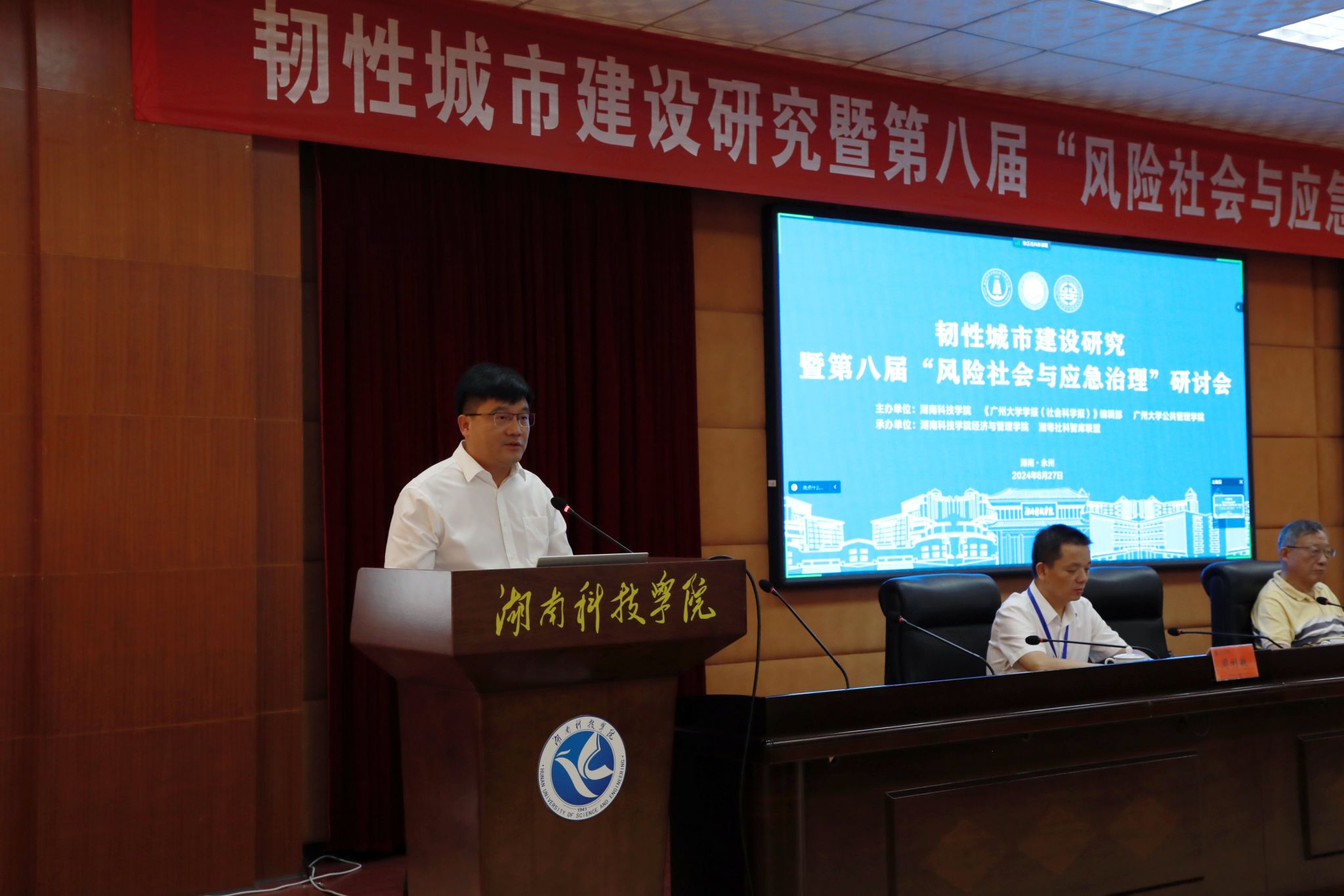 会议开幕式上,校党委书记李钢发表致辞,代表学校对出席研讨会的专家、学者表示热烈的欢迎和诚挚的感谢。他表示,本次学术研讨会为大家搭建了研讨交流最新成果和发展动态的机会,希望能通过平台的合作,共同助力韧性城市建设和风险应急治理,为中国式现代化建设贡献更多力量。《广州大学学报(社会科学版)》主编陶东风教授发表线上致辞,南京大学政府管理学院教授、博士生导师童星,南华大学党委书记、中南大学、南华大学教授、博士生导师高山分别发表致辞。开幕式由校党委委员、副校长何福林主持。