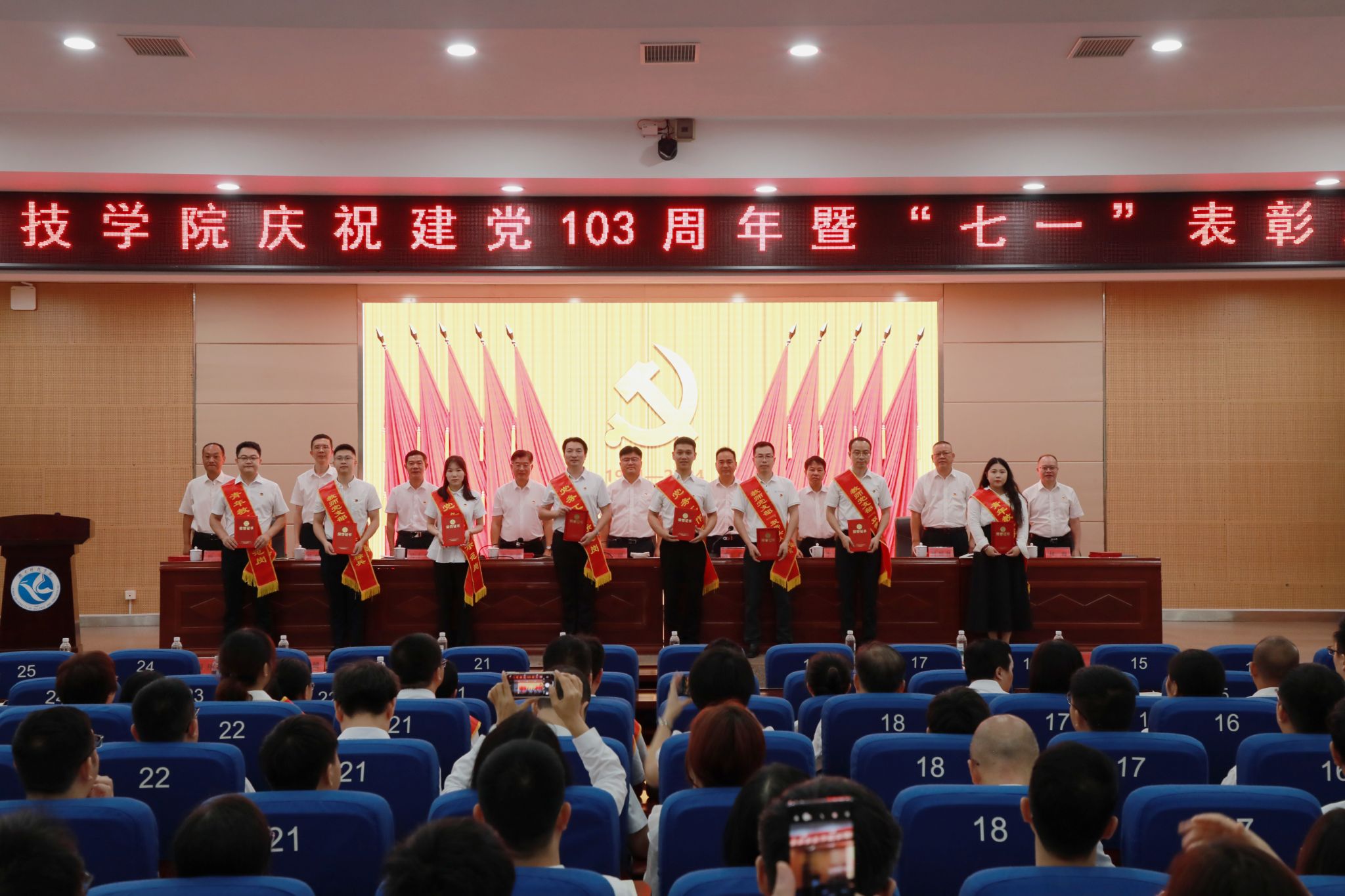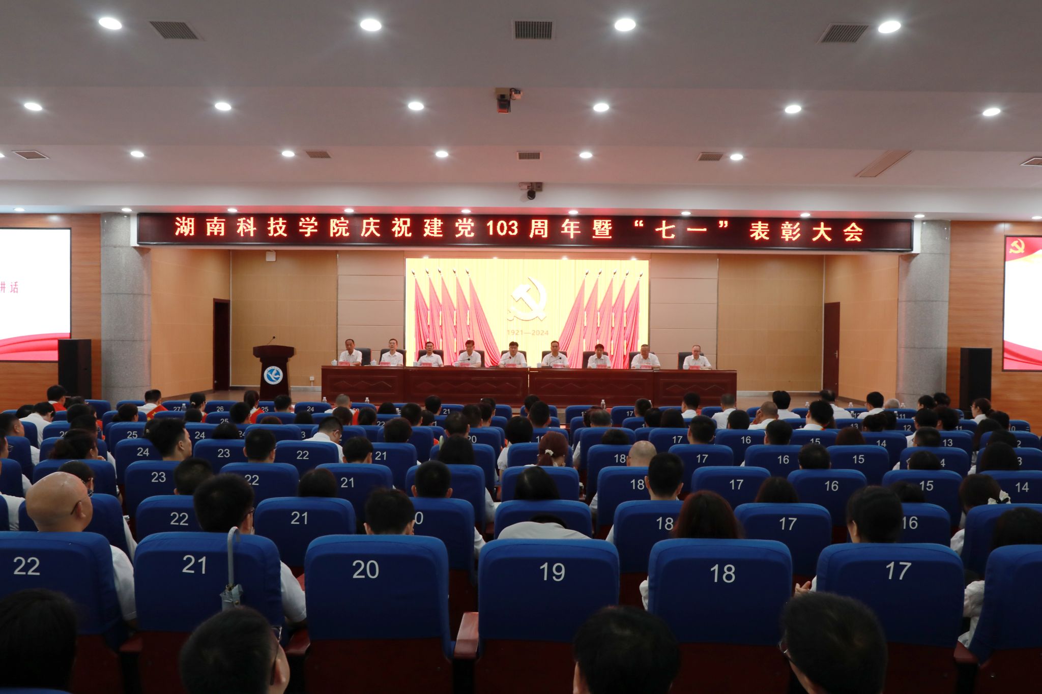 本网讯(记者 向薛峰 谢志豪)7月1日,学校在潇湘大讲堂举行庆祝中国共产党成立103周年暨“七一”表彰大会。党委书记李钢、校长黄创霞,校领导宋宏福、李常健、吴小林、何福林、陈灿军、何海,党委委员、组织部部长杨涛,受表彰对象、党员中层干部和全体教师党员参加会议。会议由黄创霞主持。