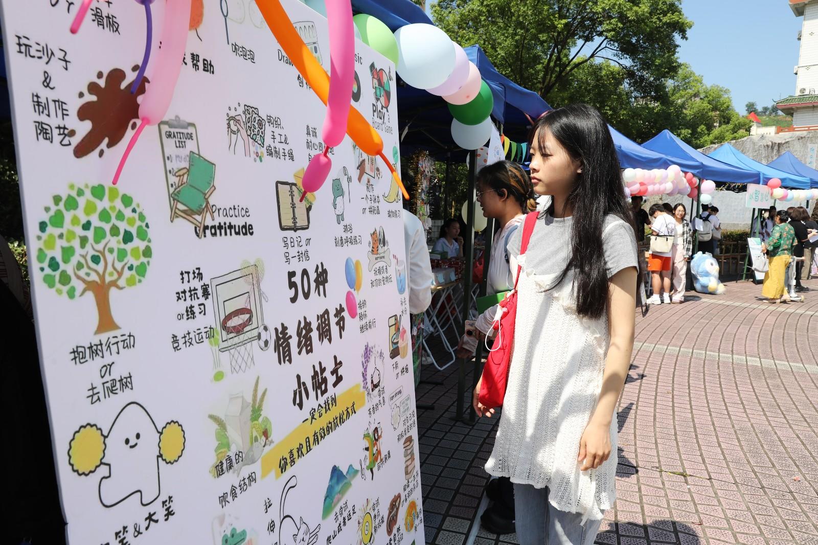 活动现场氛围热烈,“足球情绪踢靶”吸引众多学生参与,参与者用足球踢向标有情绪标签的靶子,大声喊出“踢飞压力”等释放宣言;在“独一无二的指纹树”创意涂鸦幕布前,师生们按下彩色指纹,写下鼓励话语,集体绘就“心灵大树”……各学院打造的沉浸式特色活动,让学生在运动释放、艺术创作中感知心理成长的力量,现场笑声与掌声此起彼伏。