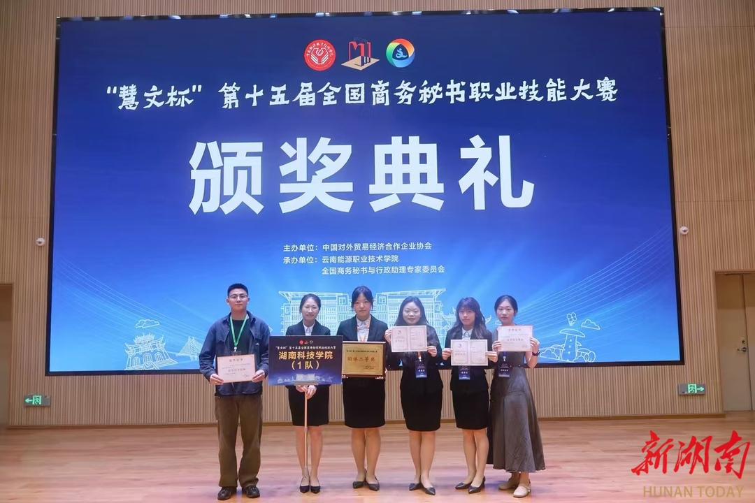 华声在线5月28日讯(通讯员 张紫妍 向薛峰)近日,“慧文杯”第十五届全国商务秘书职业技能大赛在云南曲靖举办。在beat365中文官方网站文法学院谷显明、尹华君、曾芳、宋艳旭、何建良、莫顺斌等老师的指导下,由范庆奇、周雯老师带队,秘书专业学生张紫妍、余鑫熠、谭晶、董依岚同学组成的参赛队伍凭借扎实的专业功底和出色的现场发挥,在本次大赛中荣获团体二等奖,董依岚同学斩获秘书专项事务处理个人三等奖的优异成绩。