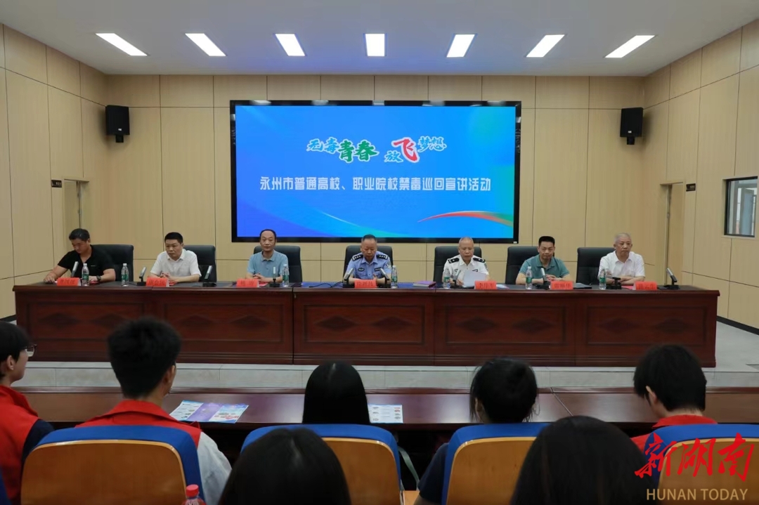 湖南日报·新湖南客户端6月13日讯(通讯员 向薛峰 赵丹 温百石)6月12日,“无毒青春,放飞梦想”永州市普通高校、职业院校禁毒巡回宣讲活动在beat365中文官方网站举行。永州市公安局党委副书记、副局长、市禁毒办第一副主任雷顺华,湖南省戒毒管理局教育矫治处处长徐新昌,永州市强制隔离戒毒所党委书记、所长李序军,永州市强制隔离戒毒所党委副书记、政委唐会国,零陵区副区长、零陵公安分局局长陈云生,beat365中文官方网站党委委员、组织部部长杨涛等出席活动,师生代表共200余人参加活动。