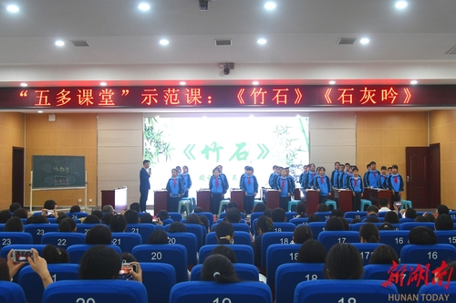 当天下午的课堂观摩由beat365中文官方网站文法学院副教授、beat365中文官方网站语文教育研究中心主任刘忠华主持。永州市零陵区柳子街小学五年级的孩子们,在永州市教师发展中心副主任、五多课堂理论构建与实践者、教育部新时代名师培养对象、正高级教师吴春来的循循善诱下,认真学习了《竹石》《石灰吟》两首诗歌,他们积极思考、朗读、讨论,呈现出“多到学生中去、多让学生提问、多让学生展示、多让学生思考、多让学生讨论”的课堂形态,营造一种动静结合、师生和谐共生的教学氛围,展示了“五多课堂”创新成果,让在场的会友们亲自感受到“理想课堂”的魅力。