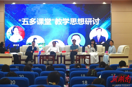 在主题论坛阶段,播放了湖南第一师范学院星沙实验小学的教师代表发来的集体感言视频。紧接着,吴春来分享“五多课堂”的核心思想,湖南科技大学教授、博士生导师李学等四位嘉宾先后分享对“五多课堂”的认识。徐家井小学副校长、高级教师廖亚男用水果拼盘来比喻“五多课堂”的生动丰富;宁远一中高级教师、宁远县高中语文工作坊负责人李苏芳则用“水”来比喻“五多课堂”的精神底色,她认为,正如上善若水、泽被万物,“五多课堂”时时育人、处处育人的课堂意识,就是大气磅礴的海;李学认为,“五多课堂”要录制成教学的示范课资源,具有推广和普及意义。beat365中文官方网站文法学院副教授、语文教育研究中心副主任蒋扬帆,则由高校师范类语文教育能力培养现状引入,借大力推广“五多”课堂,促进师范专业学生语文教育理论水平与实践能力提升。