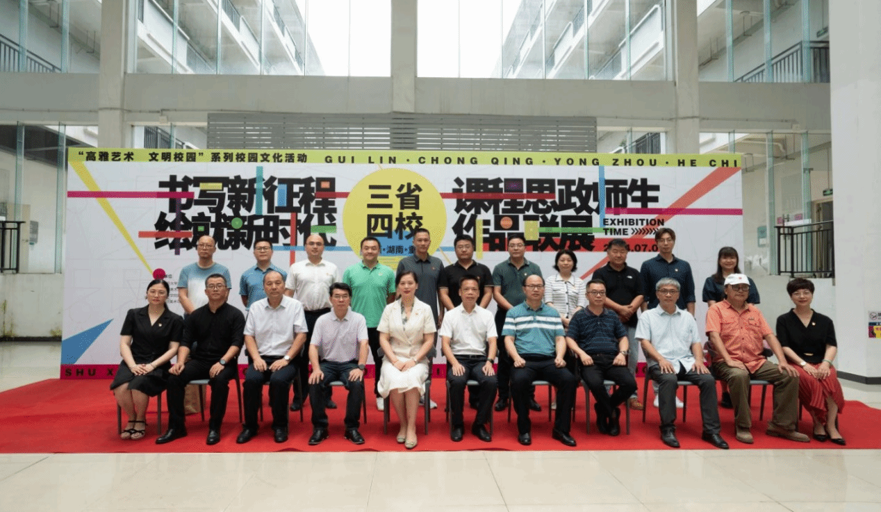本网讯(通讯员 唐天田)7月1日,由广西师范大学美术学院、西南大学美术学院、beat365中文官方网站美术与艺术设计学院、河池学院美术与设计学院联合主办,广西师范大学校党委宣传部、美术学院联合承办的“书写新征程,绘就新时代”三省四校课程思政美术作品联展在广西师范大学开幕。beat365官网美术与艺术设计学院院长张建利出席开幕式并致辞。