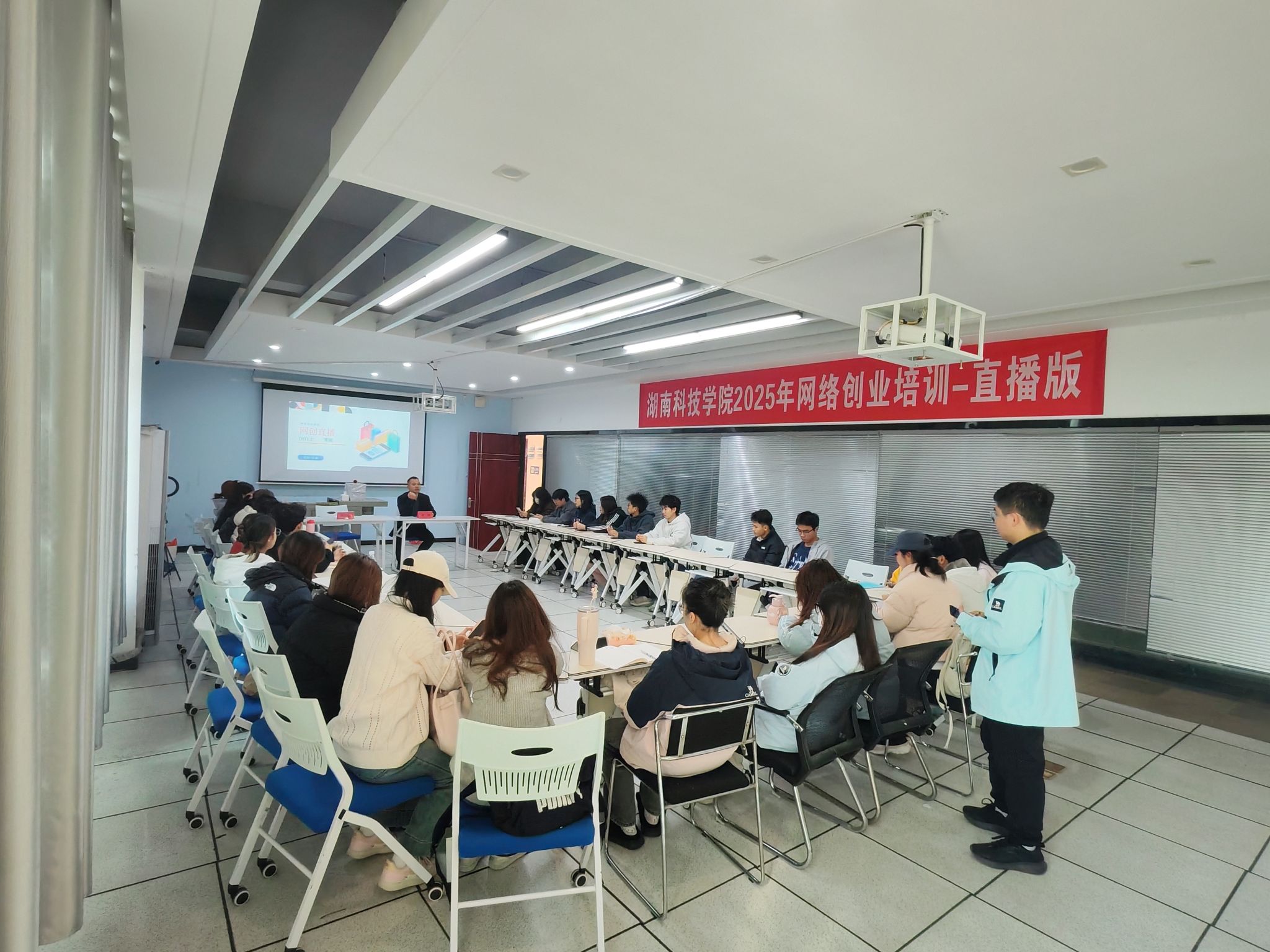 本网讯(通讯员 唐豪泽)12月12日,学校首期网络创业精英示范班正式开班,30名经遴选的校内精英学员参与培训。学校特邀网络创业培训经验深厚的罗雄老师主讲,课程聚焦网创趋势、运营技巧、流量变现及风险防控等核心内容,以案例教学、模拟实操等形式提升学员实战能力。