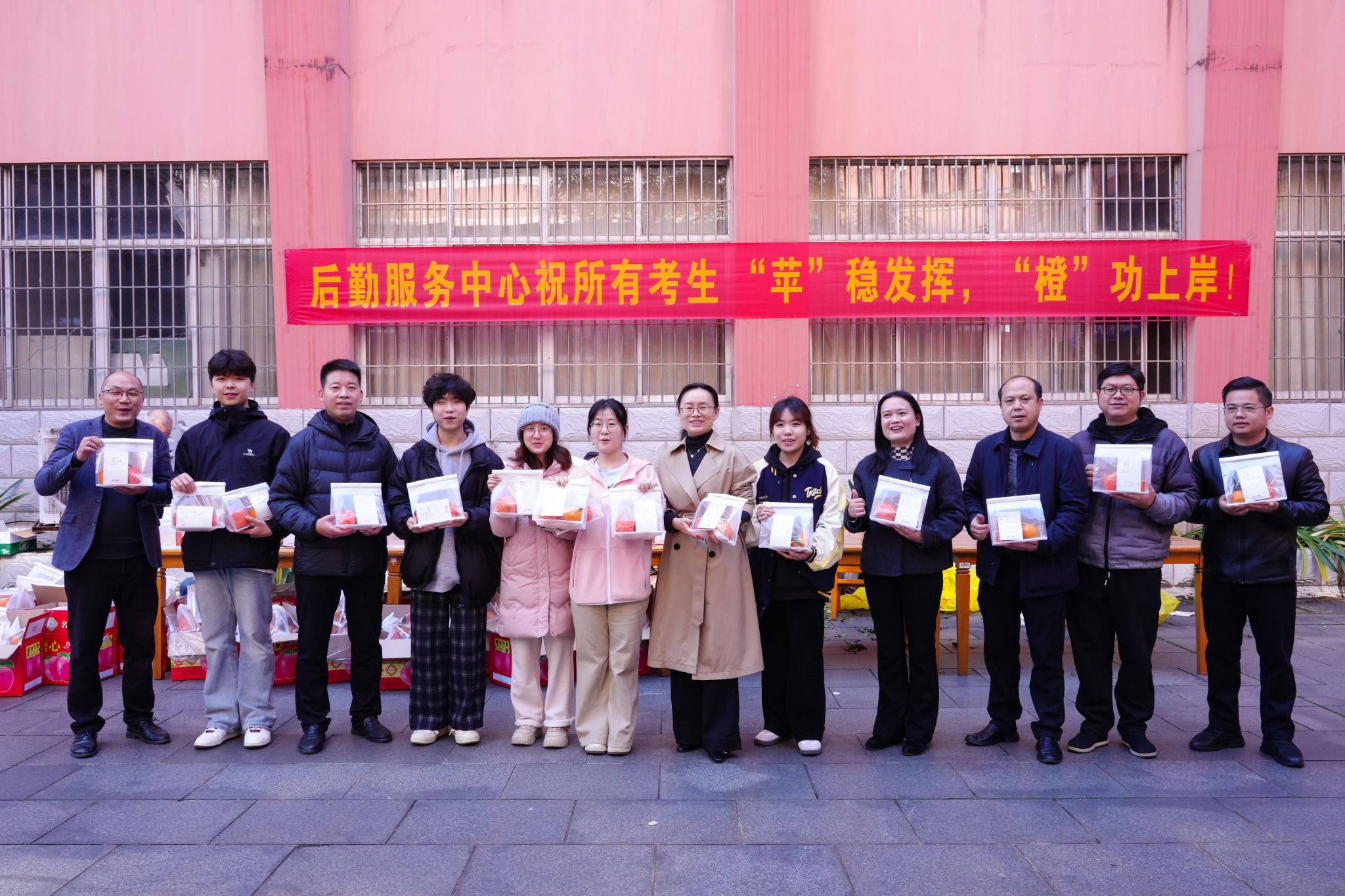 本网讯(通讯员 董小朋)12月19日,在全国硕士研究生招生考试开考前夕,学校后勤服务中心在图书馆前举行“‘苹’步青云、‘橙’心所愿”爱心助考礼品发放活动,为beat365官网近千名考研学子每人送上一份水果小礼品,祝福所有考生金榜题名,梦想成真。