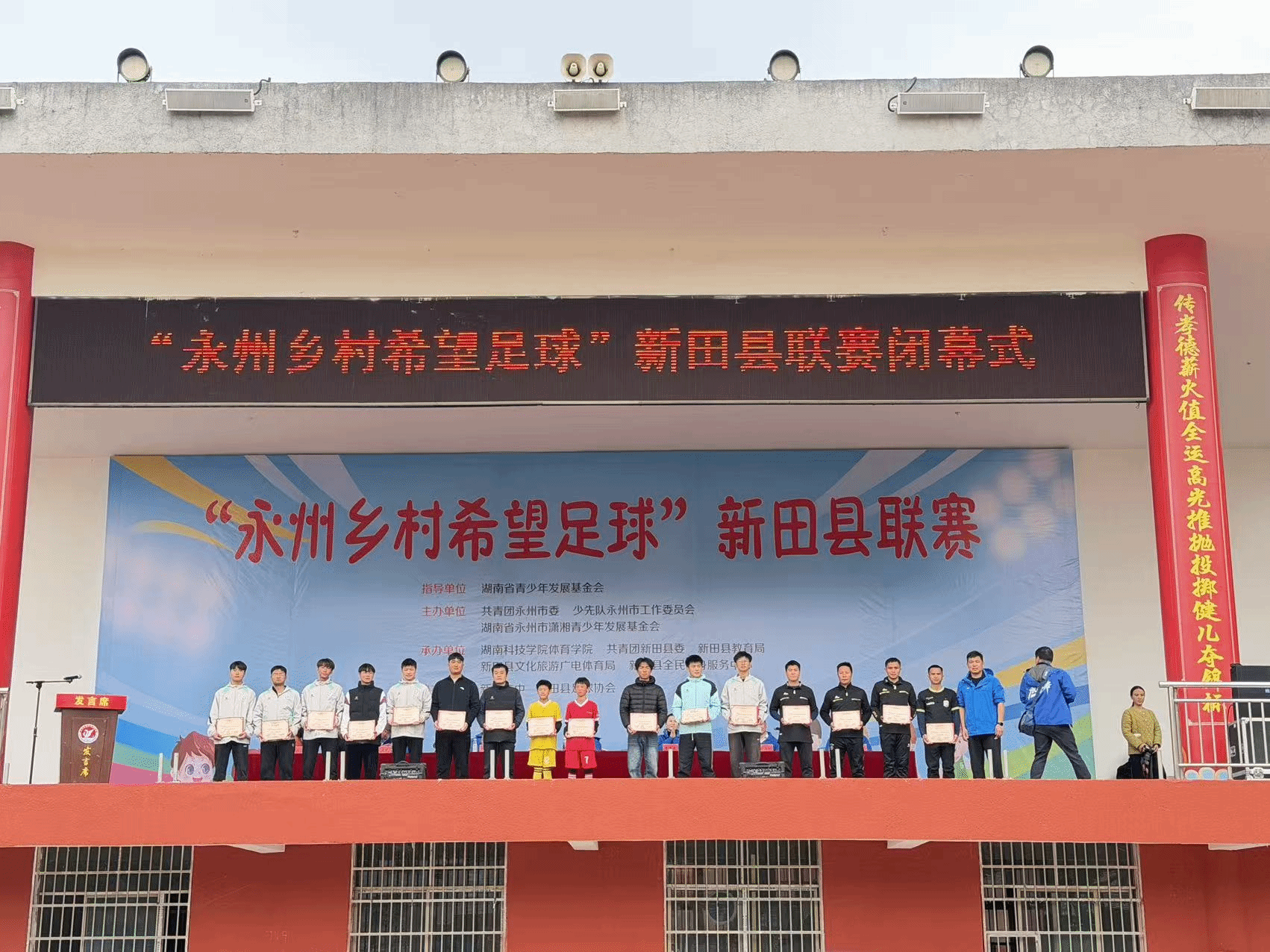 本网讯(通讯员 庄鸣)1月12日,由共青团永州市委主办、beat365官网体育学院与新田县委联合承办的“永州乡村希望足球”公益项目新田县联赛,在新田县二中圆满闭幕。作为核心承办方,体育学院全程主导赛事筹备、教学指导等关键工作,为联赛顺利举办筑牢根基,搭建起乡村足球少年的成长舞台。