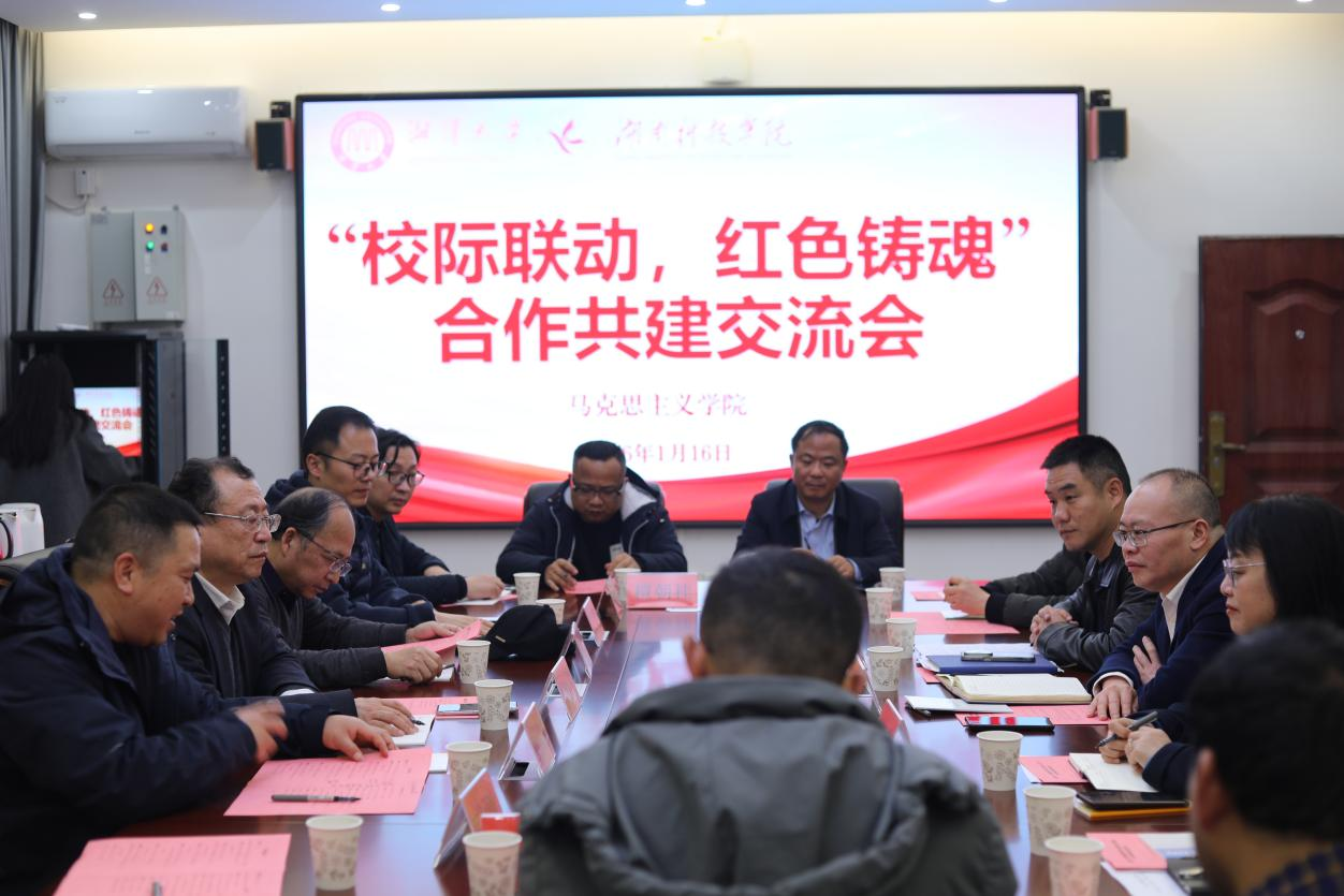 本网讯(通讯员 吴志伟)1月16日,湘潭大学马克思主义学院来beat365官网开展合作共建交流。校党委委员、副校长何海及马克思主义学院领导班子成员、教师代表参加交流。