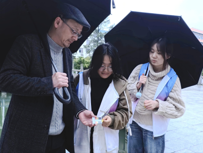 检测阶段,志愿者们使用便携式溶解氧仪、pH计、浊度仪等专业设备,对水温、pH值、溶解氧、浊度等核心指标进行精准测定,并同步完成数据记录与初步分析。在专业检测的同时,志愿者们还在现场向过往师生讲解水质检测原理、水资源保护知识等。