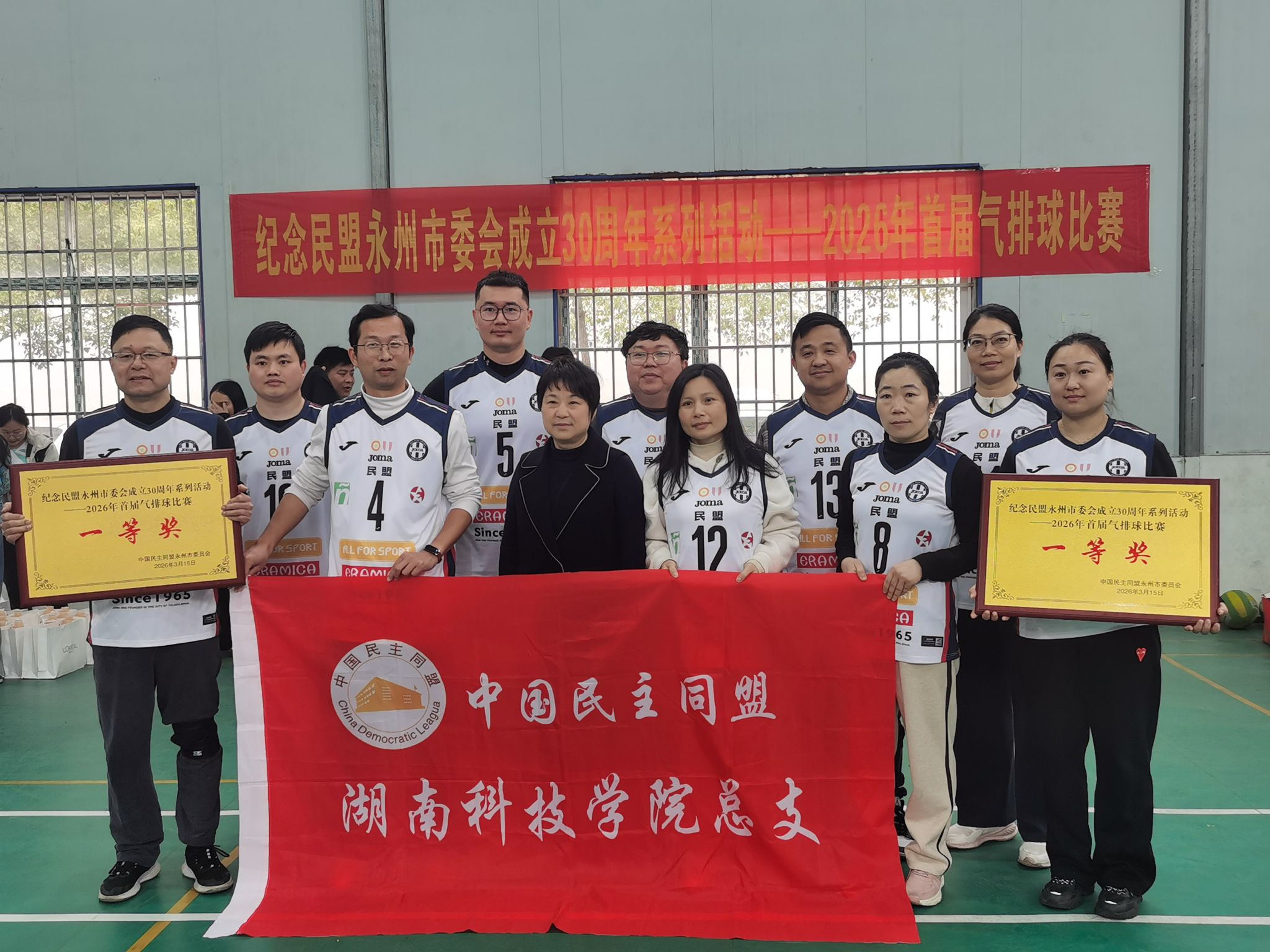 本网讯(通讯员 龚绍峰)近日,民盟永州市委会纪念成立30周年暨2026年首届气排球比赛圆满收官。beat365官网民盟总支与永州市一中民盟支部组成的联合代表队,一路过关斩将获得冠军,充分展现了beat365官网盟员团结奋进、锐意进取的良好精神风貌。