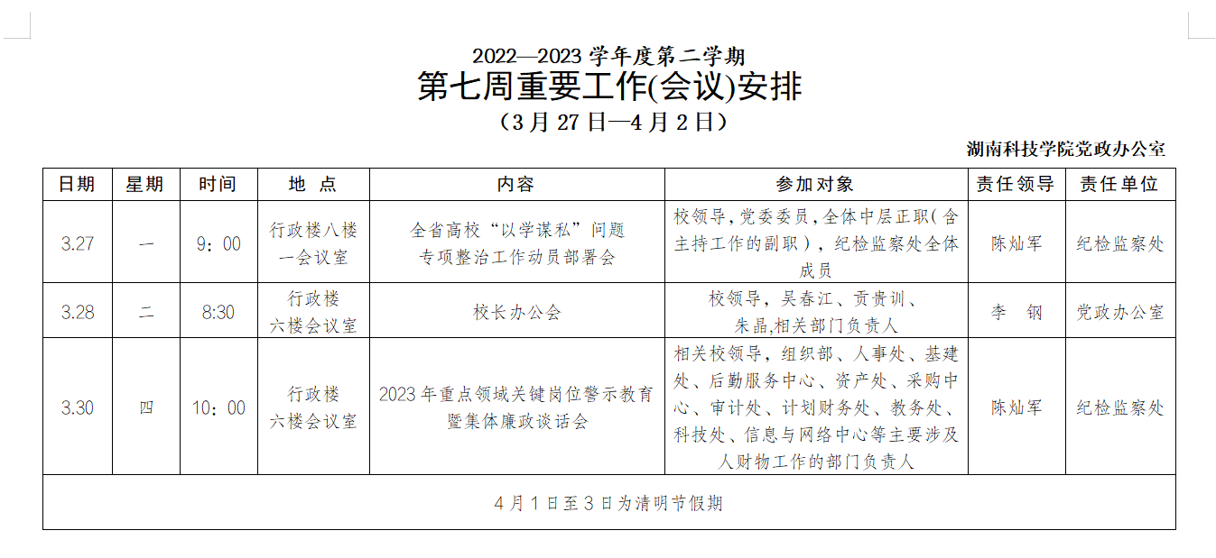 [党政办]第七周重要工作(会议)安排(3月27日-4月2日)