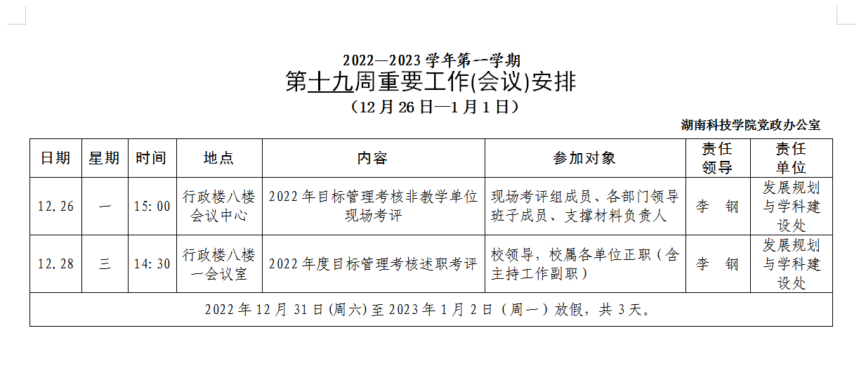 [党政办]第十九周重要工作(会议)安排(12月26日—1月1日)