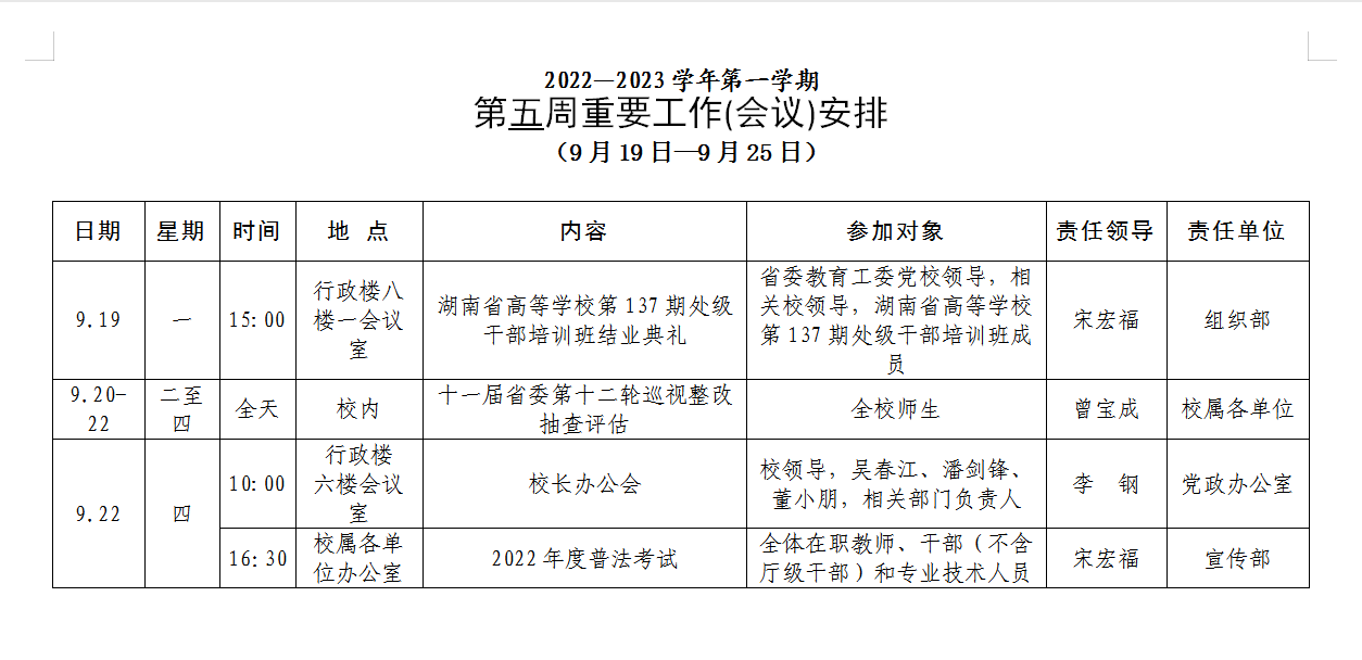 [党政办]第五周重要工作(会议)安排 (9月19日—9月25日)
