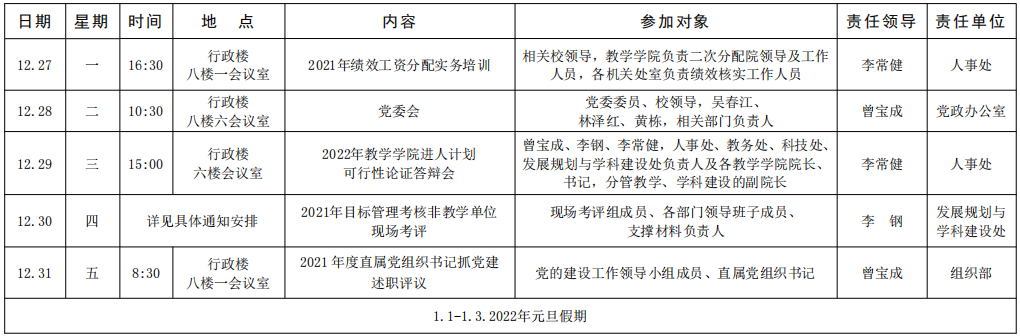 [党政办]第十八周重要工作(会议)安排 (2021 年 12 月 27 日—2022 年 1 月 2 日)