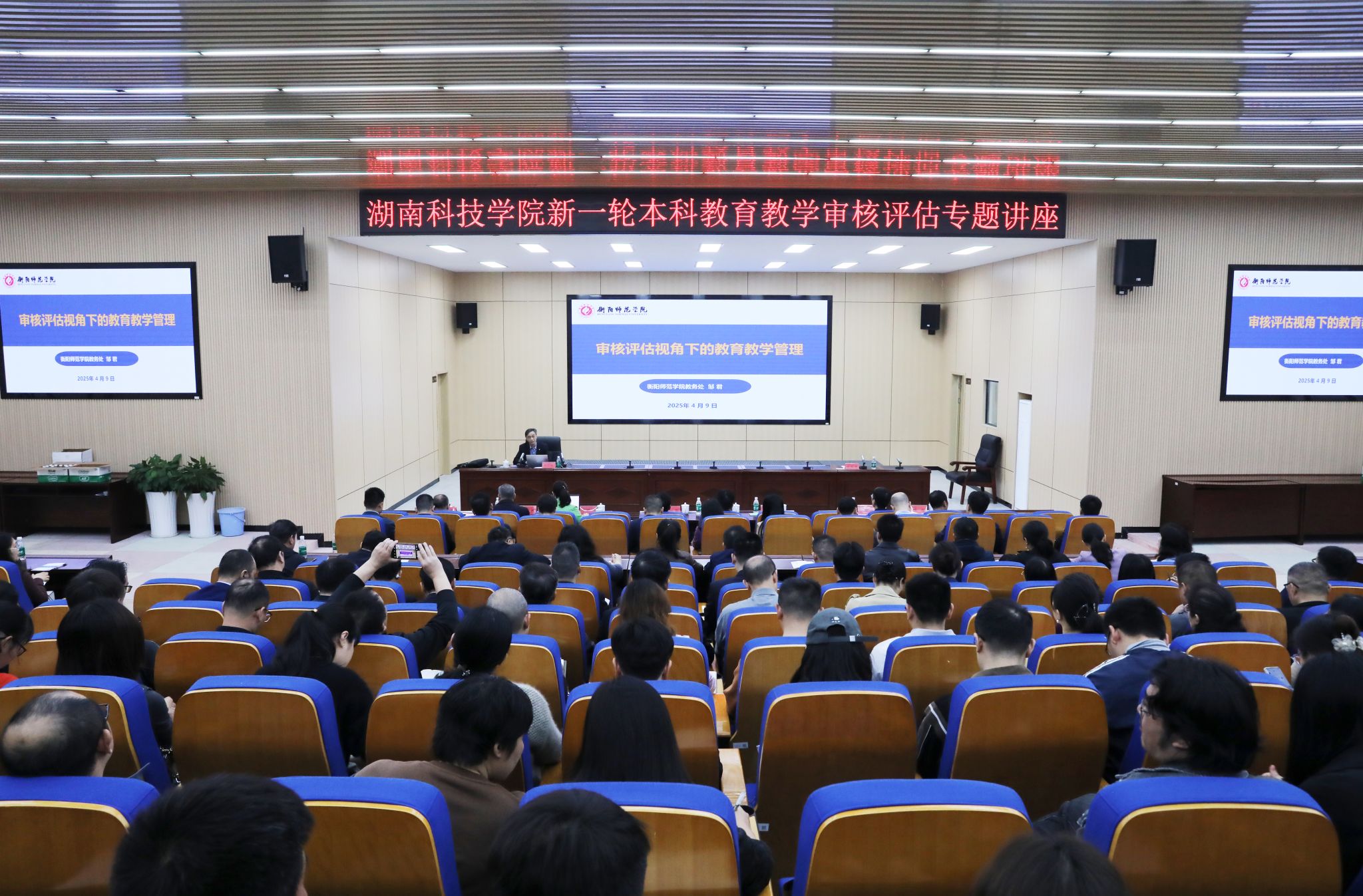 本网讯(记者 张云芳 摄影 谢志豪)4月9日,学校开展本科教育教学审核评估专题讲座,衡阳师范学院教务处处长邹君、教学质量监控中心常务副主任谭晓兰应邀来校作专题培训。校党委书记李钢,党委副书记、校长黄创霞,校领导李常健、何福林、陈灿军、何海,党委委员、组织部部长杨涛出席。
