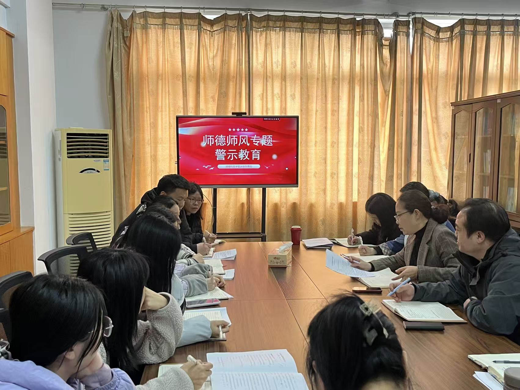 师德师风警示教育会议上,高树琴通报了师德师风警示教育典型案例,并领学《高校教师禁行行为“红七条”》、《教育部关于严禁教师收受礼品礼金的“六条禁令”》等文件,要求全体人员坚守师德底线、严守纪律红线、筑牢廉洁防线,以更高标准、更实作风,将师德师风建设融入财务工作全过程。