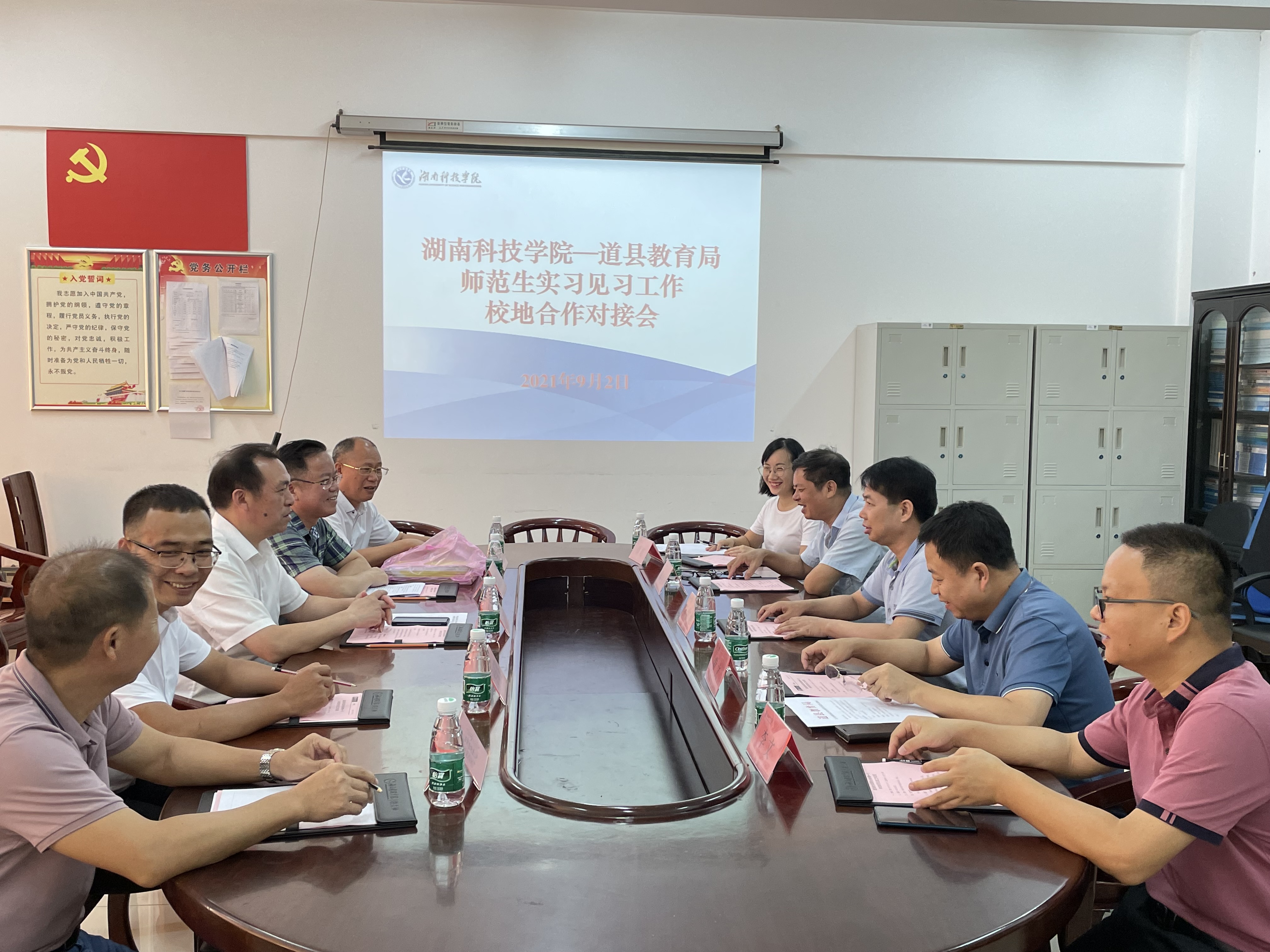 本网讯 9月2日,道县教育局局长陈林静、人事股股长蒋施龙、工委秘书股股长罗新鹏、道县绍基学校校长胡仁、副校长周建光一行来校就师范生实习见习工作进行洽谈交流。党委委员、副校长李常健,教务处处长黄文、副处长李文、实验实训科副科长谭娟参加会议。会议由黄文主持。
