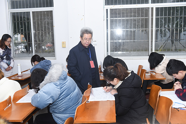 本网讯 1月7日,学校2018年下期期末考试拉开帷幕,考试时间将持续到1月16日。开考当天,党委书记、校长曾宝成亲临考场进行巡考,仔细察看考场秩序、环境卫生,并检查考试试题、答卷进度,不时驻足观看同学们的作答情况,对期末考试工作进行深入细致的检查。教务处、教学质量管理处等职能部门负责人参加。
