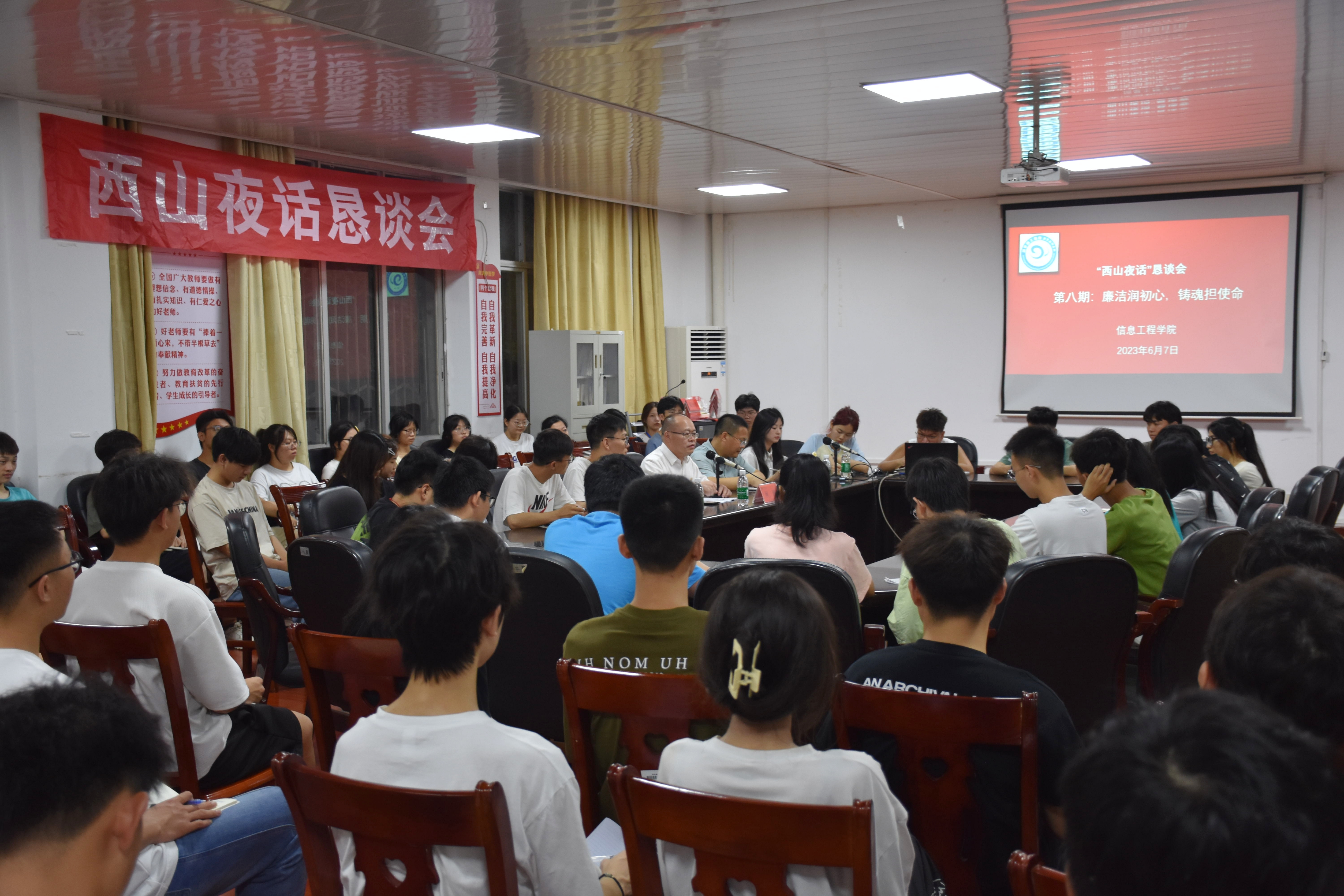 本网讯(通讯员 王鼎涵 刘兵兵)6月7日晚,信息工程学院举行第八期“西山夜话”恳谈会,校党委委员、副校长何海担任主讲嘉宾,该院100余名学生党员、学生干部参加现场交流,师生们围绕“廉洁润初心,铸魂担使命”的主题,同声话廉洁,合力颂清风。