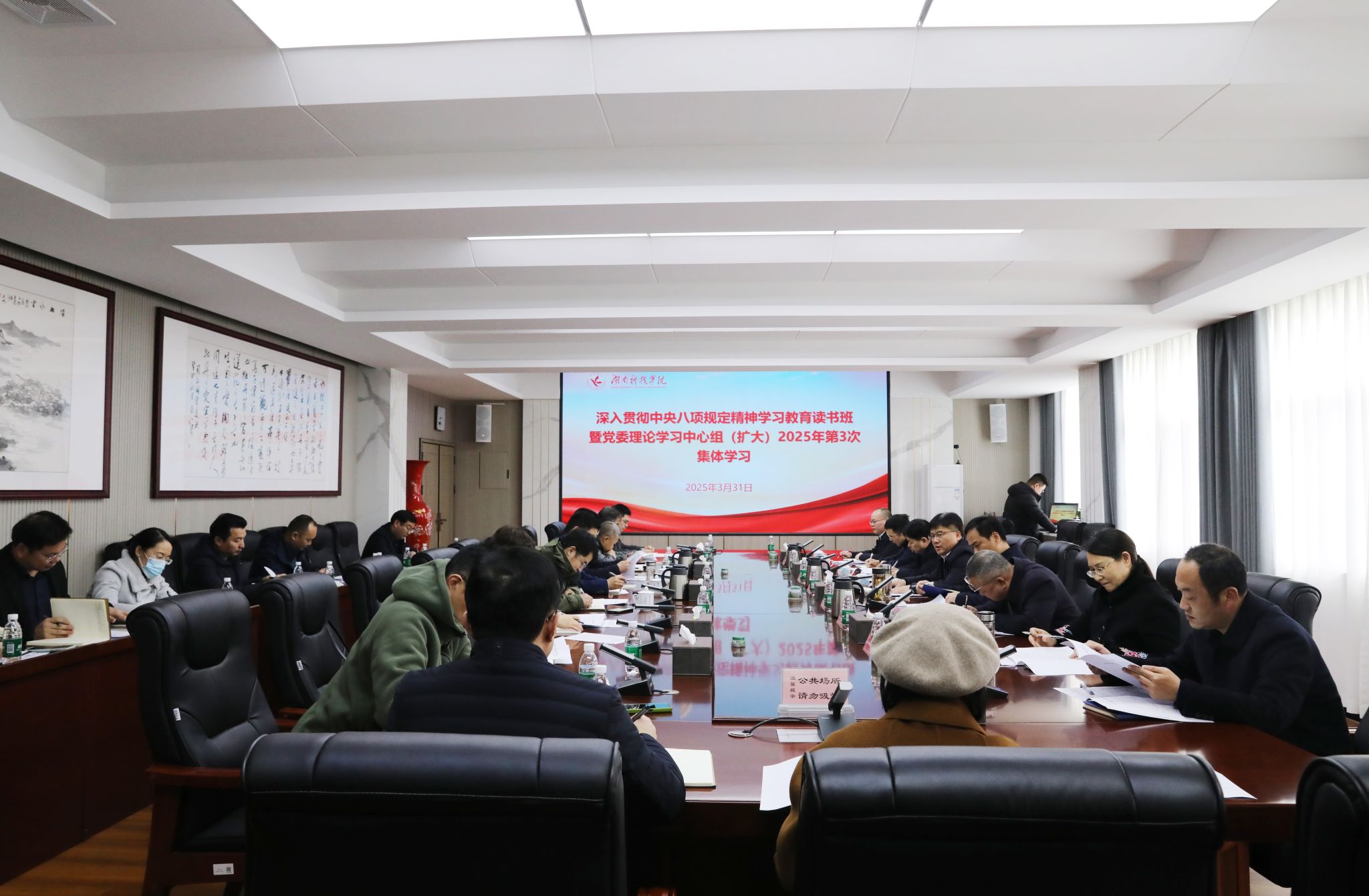 本网讯(记者 向薛峰 摄影 谢志豪)3月31日,学校举行深入贯彻中央八项规定精神学习教育读书班暨党委理论学习中心组2025年第3次集体学习,强调要深入学习贯彻习近平总书记关于加强党的作风建设的重要论述精神和中央八项规定及其实施细则精神,抓紧抓实学习教育,推进作风建设常态化长效化,为推动学校各项事业实现高质量发展提供坚强保障。全体党委委员参加,副校长郑银芳,党政办公室、宣传统战部、纪检监察处相关负责人,各直属党组织书记列席。