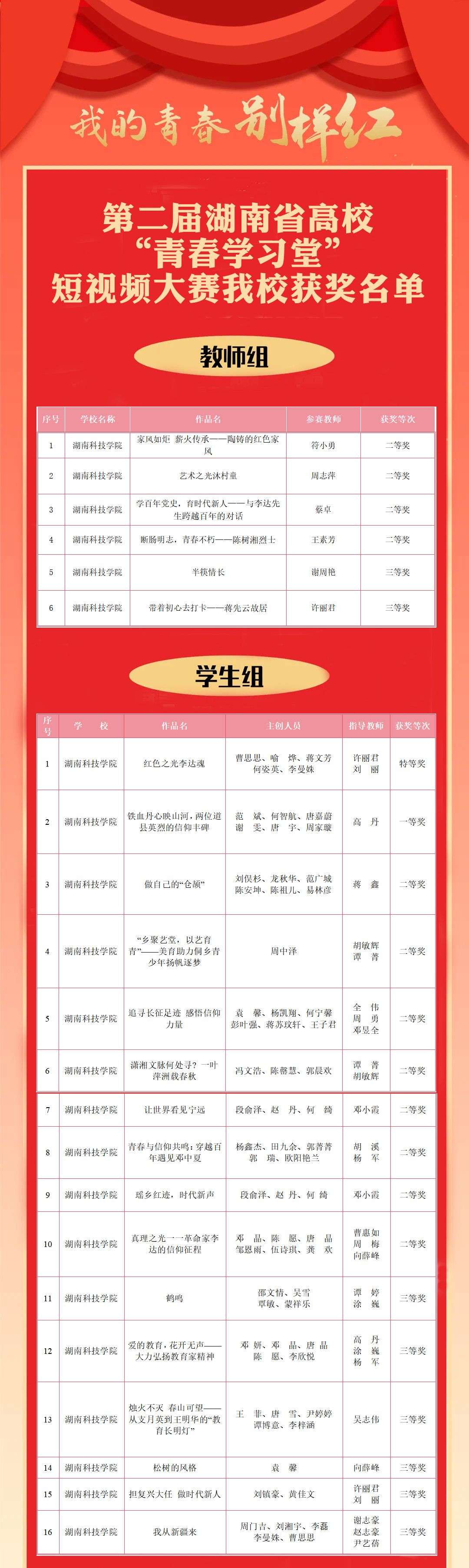 本网讯(记者 孙淑娴)近日,由中共湖南省委教育工委、湖南省教育厅、湖南日报社联合主办的湖南省第二届高校“青春学习堂”短视频大赛评选结果揭晓。beat365官网师生在赛事中表现优异,斩获特等奖1项、一等奖1项、二等奖12项、三等奖8项,并荣获“优秀组织奖”,充分展现了学校扎实推进思政教育的阶段性成果。
