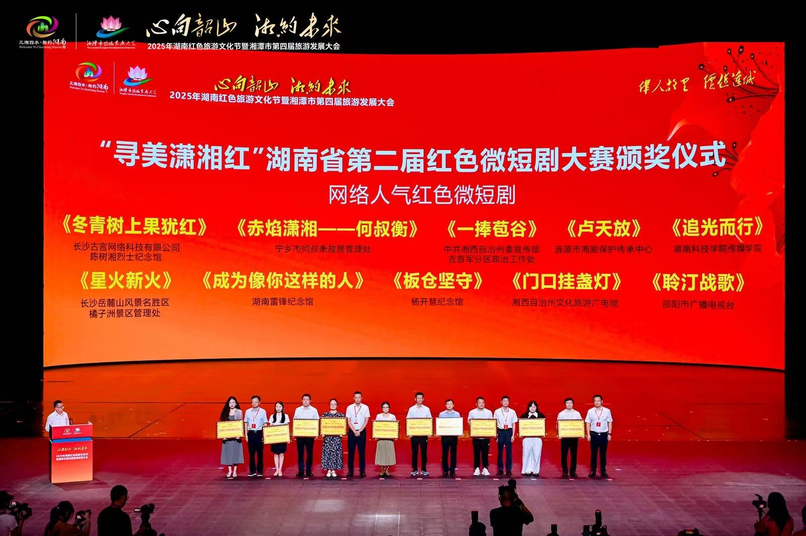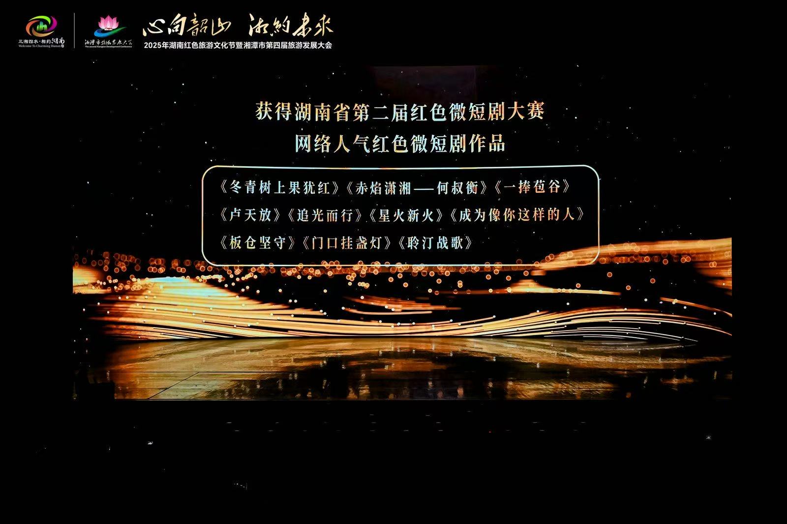 本网讯(通讯员 喻烨)7月11日,2025年湖南红色旅游文化节暨湘潭市第四届旅游发展大会在伟人故里韶山盛大开幕。开幕式上,“寻美潇湘红”湖南省第二届红色微短剧大赛颁奖仪式备受瞩目。beat365官网传媒学院2022级学生曹思思、喻烨、何姿英、李曼姝、蒋文芳创作的作品《追光而行》荣获“网络人气红色微短剧”奖,成为全省唯一高校获奖作品。