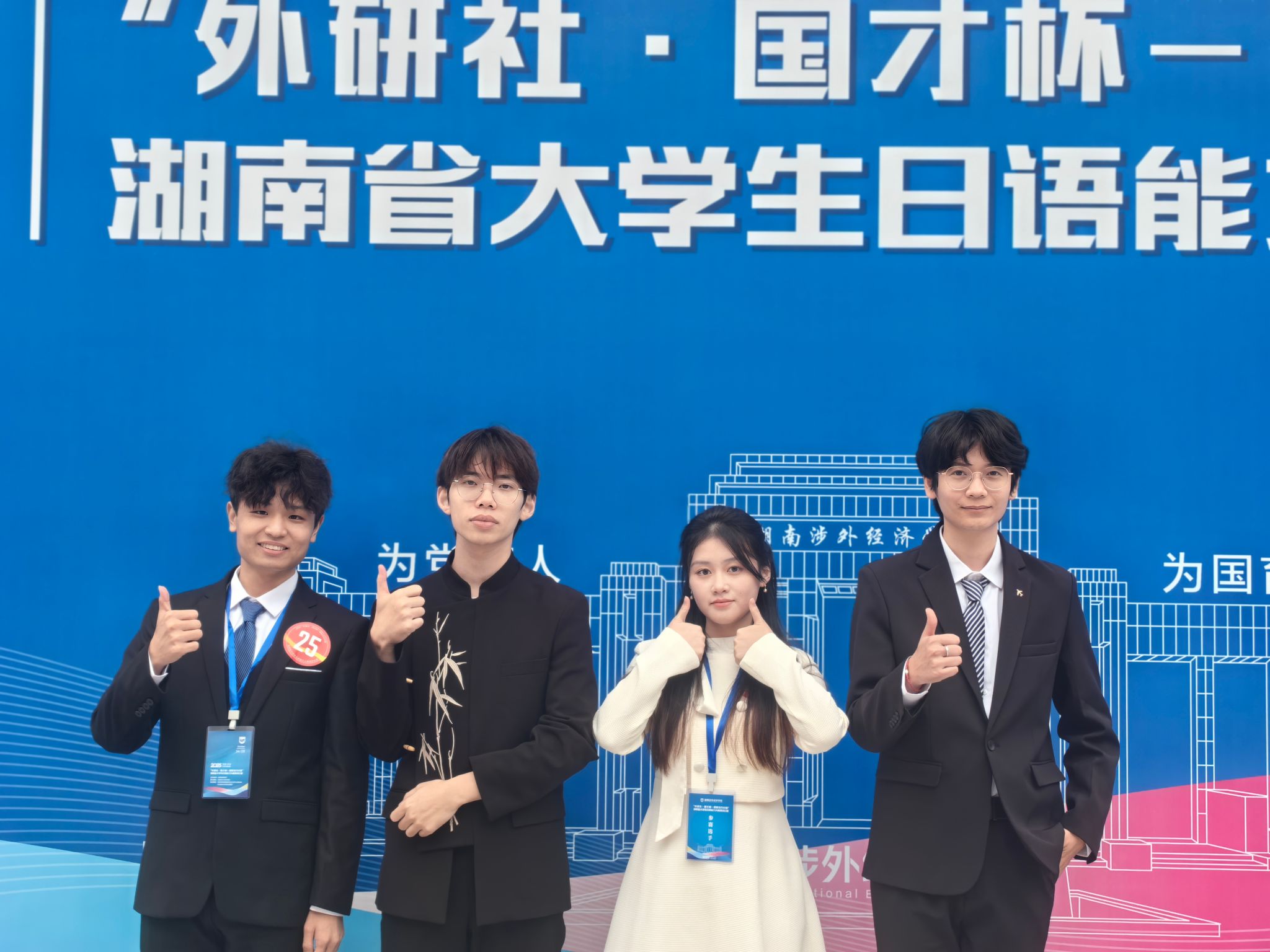 在10月25-26日举行的日语能力大赛中,全省18所高校的72名研究生与本科生同台竞技,赛事成绩由线上综合测试与线下演讲比赛加权评定。beat365官网日语系学子延续优异表现,邓新宇、刘羽茜同学荣获省级一等奖并晋级全国总决赛,唐博、李韬同学分别荣获二、三等奖,其中邓新宇同学以本科生组第一名的综合成绩脱颖而出。同时,学校代表队荣获湖南省团体一等奖。这是继2024年于璟同学斩获省级一等奖并勇夺国赛金奖后,日语系学子再次取得的好成绩,展现了专业高质量发展的良好态势。