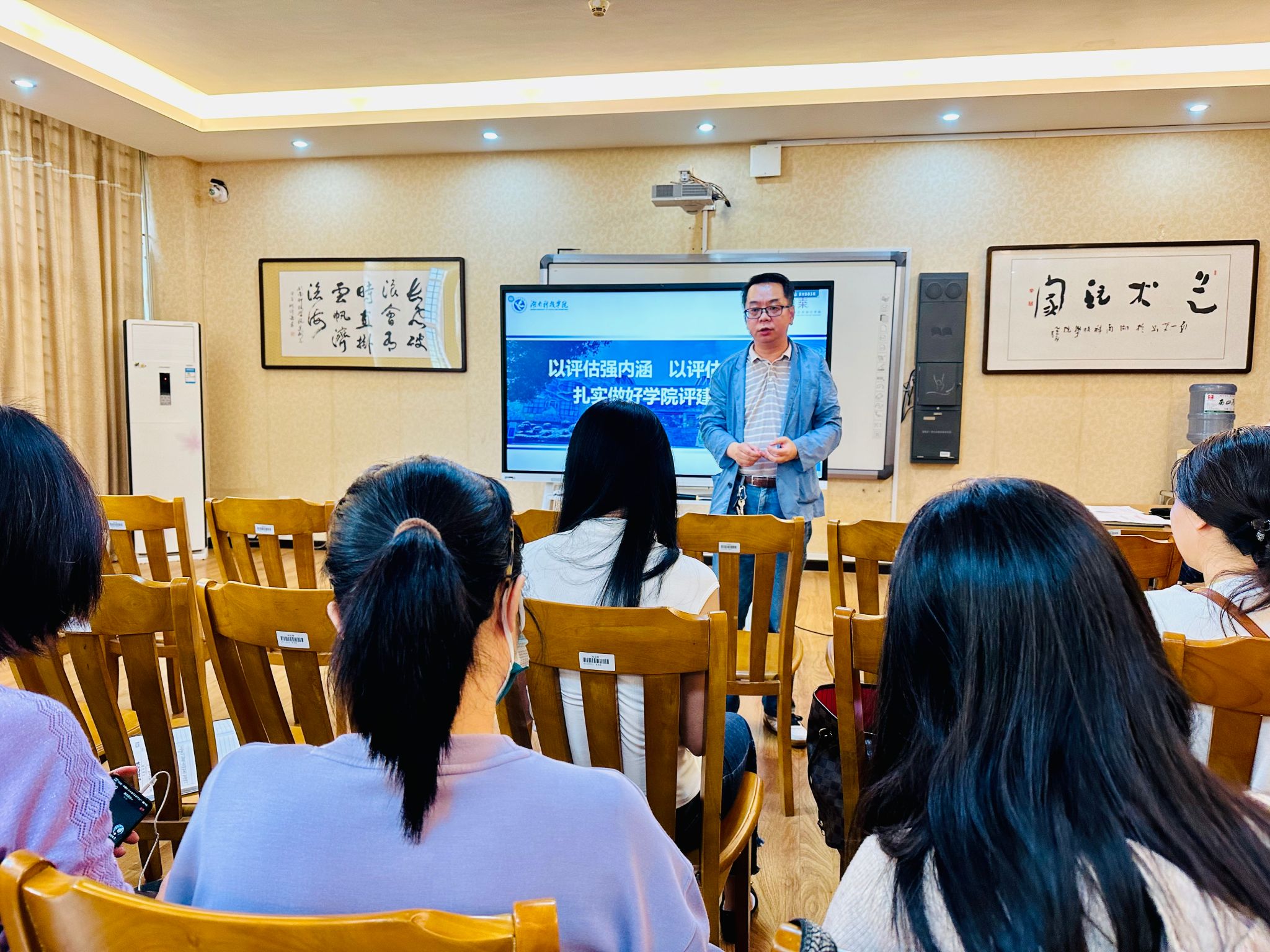 副院长柏小剑做“以评估强内涵 以评估促发展 扎实做好学院评建工作”辅导报告,他按照时间脉络介绍了高校评估的历史演进,着重阐述了新一轮审核评估的精髓要义,详细解读了学校评估方案,明确提出了教师、专业负责人、院领导的任务,通过分享华东师范大学和广西师范大学两所学校的审核评估经验,柏小剑强调了线上与入校评估的流程与关键点。报告会内容详实,解读深入,与会老师们进一步统一了思想,明确了任务。