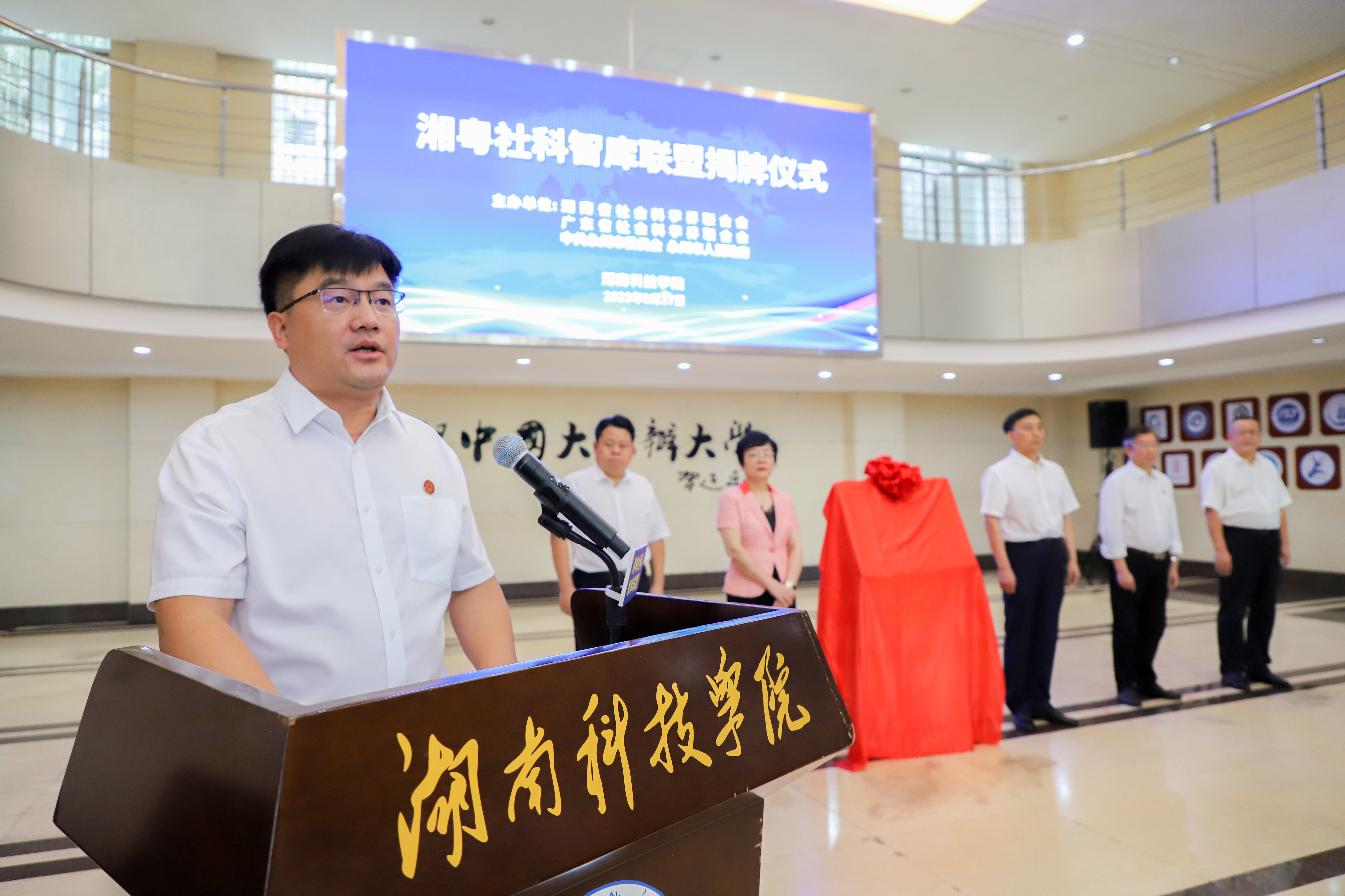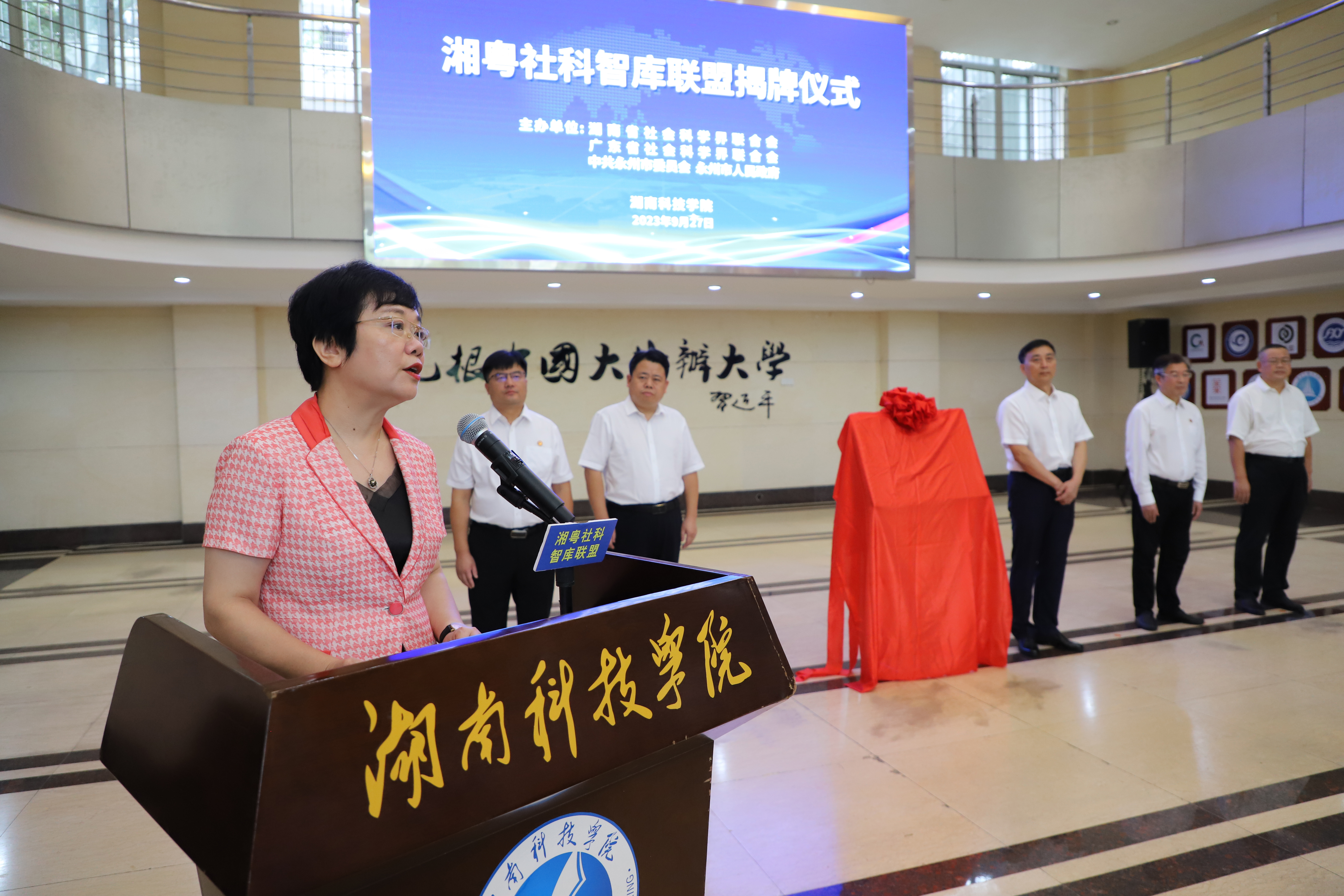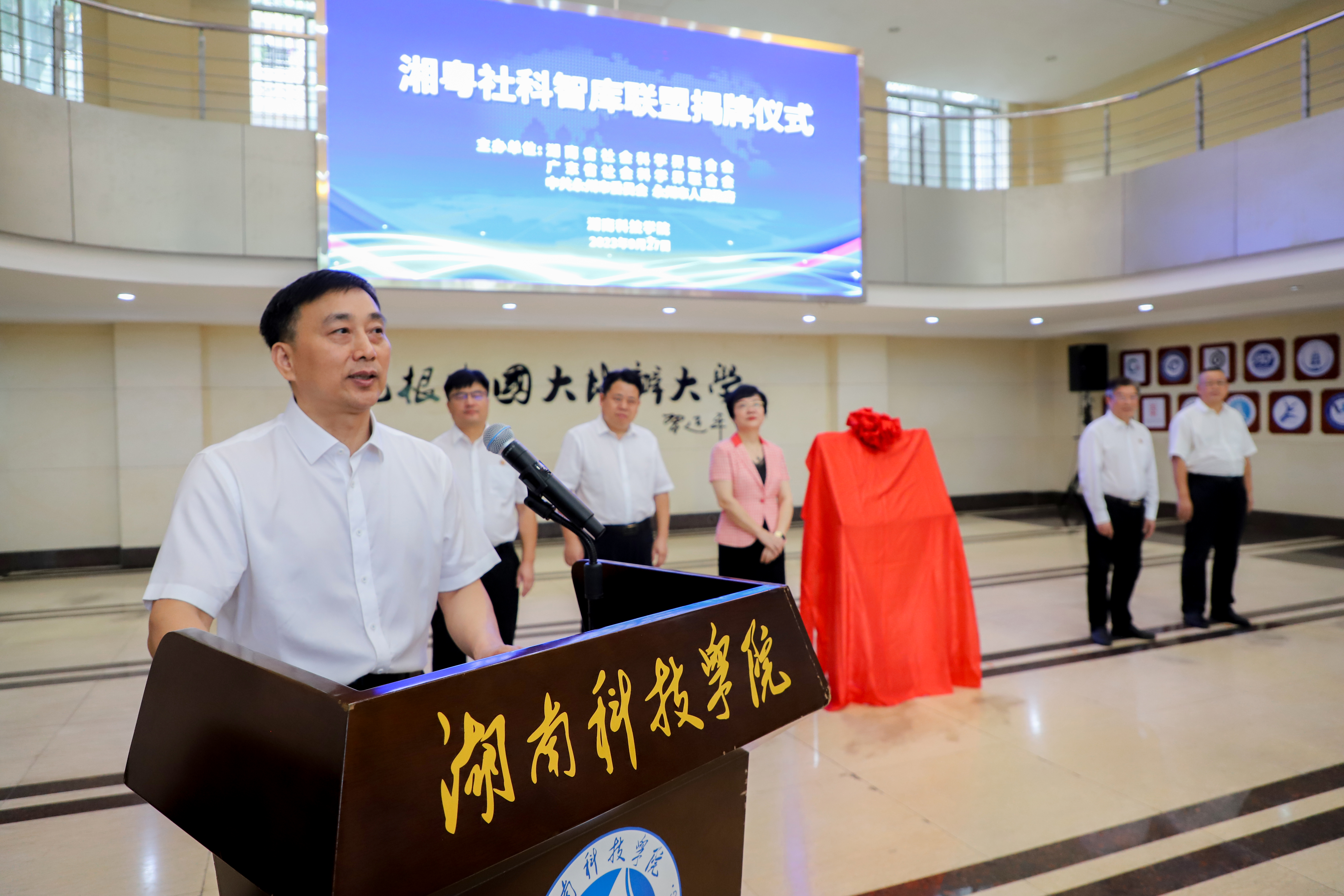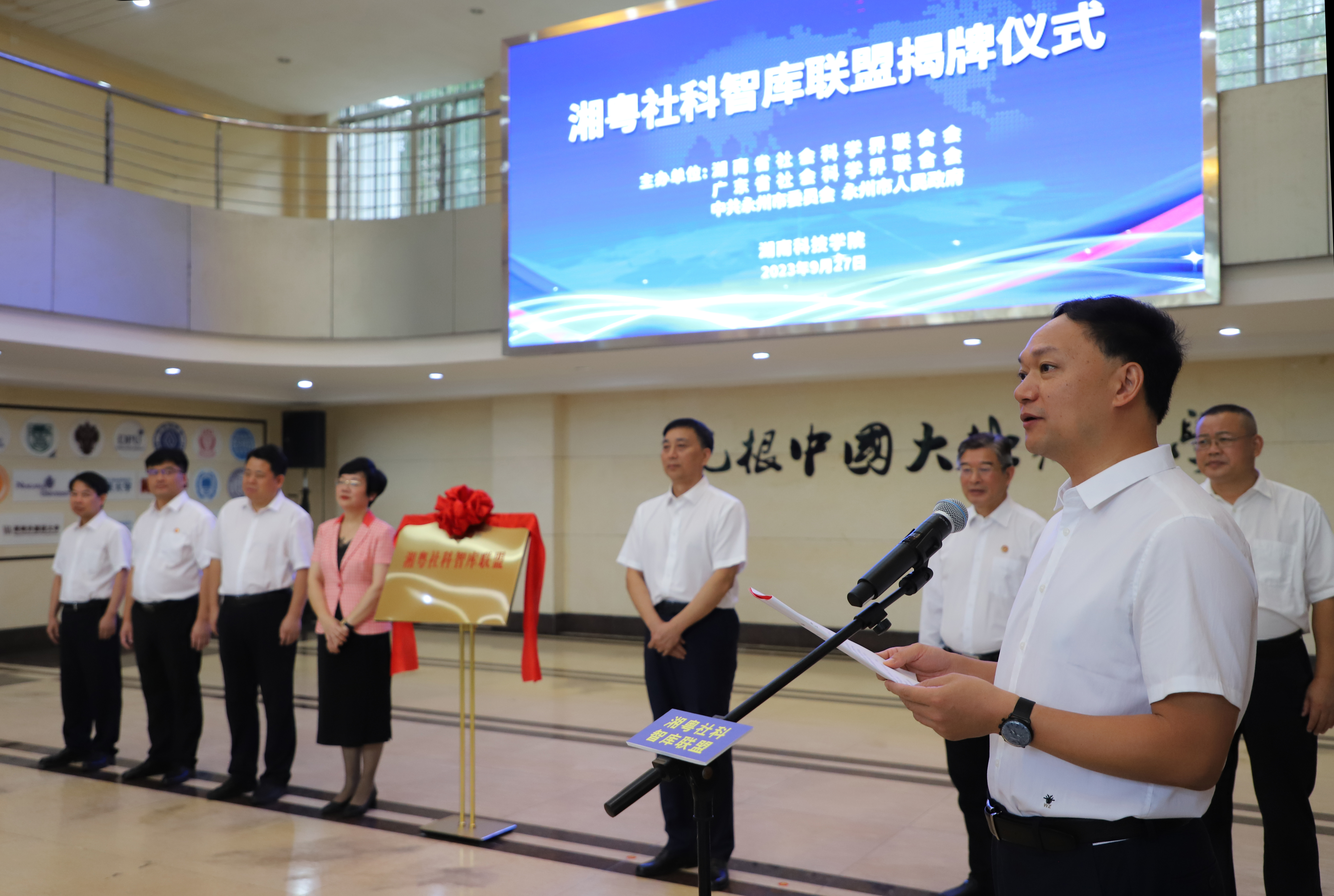 余鸿纯、王和平、刘厚、李钢共同为“湘粤社科智库联盟”揭牌。