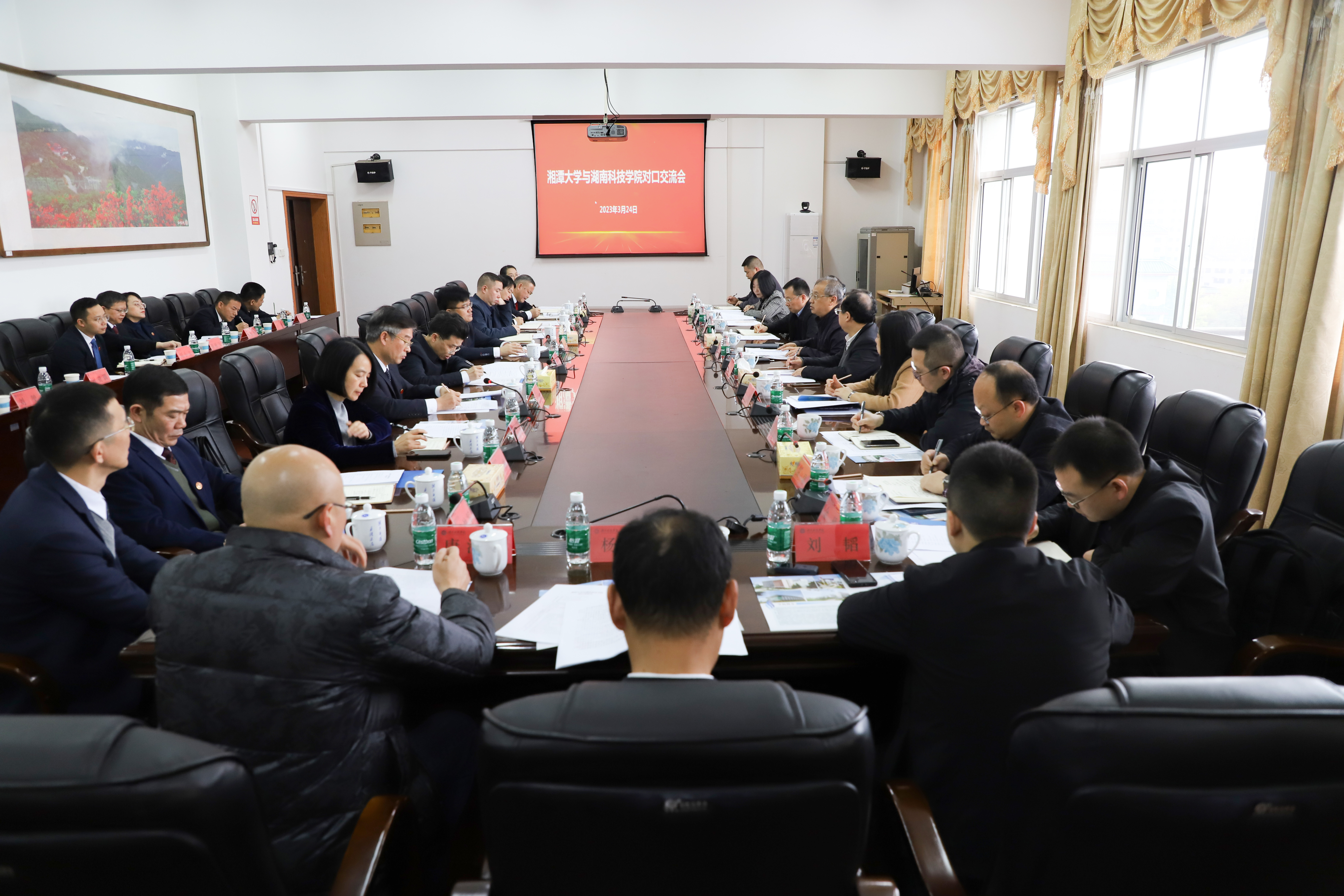 本网讯 3月24日,湘潭大学与beat365中文官方网站开展2023年对口支援合作交流座谈会。湖南省政协副主席、民进湖南省委会主委、湘潭大学校长潘碧灵,湘潭大学党委委员、副校长刘建平,永州市政协党组成员、副主席蒋井泉,永州市教育局局长黄赞校,民进永州市委会主委、零陵区副区长陈丽萍,beat365官网党委副书记、校长李钢,校领导宋宏福、李常健、吴小林、何福林、陈灿军、郑银芳,党委委员、组织部部长杨涛出席会议。会议由党委副书记宋宏福主持。