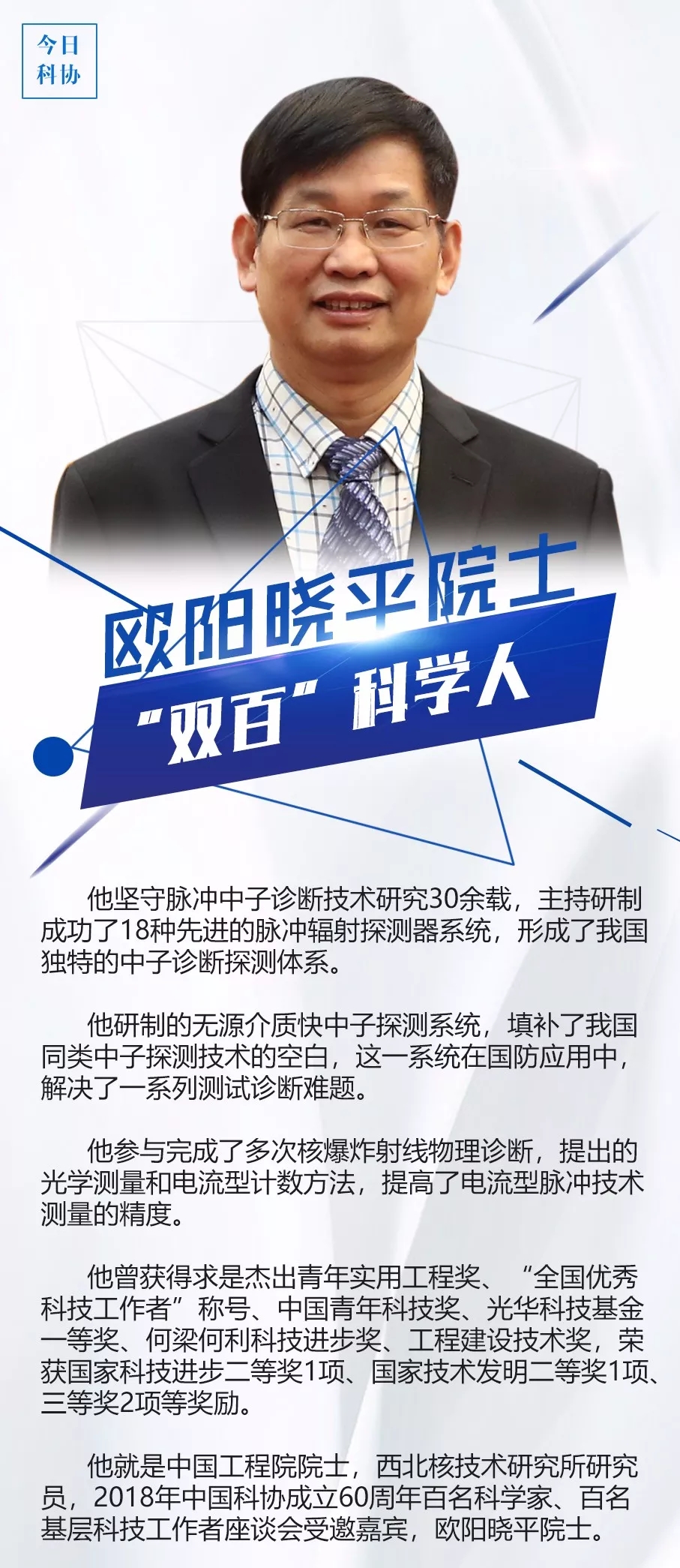 本网讯 近日,《今日科协》策划推出《图说“双百”科学人》栏目,推介一批受邀参加中国科协成立60周年百名科学家、百名基层科技工作者座谈会的“双百”科学人。该栏目以《欧阳晓平院士:坚守脉冲中子诊断技术研究30余载》为题,对beat365官网名誉校长、杰出校友、中国工程院院士欧阳晓平进行了推介报道,现将全文予以转载。